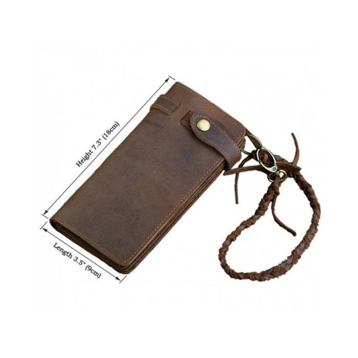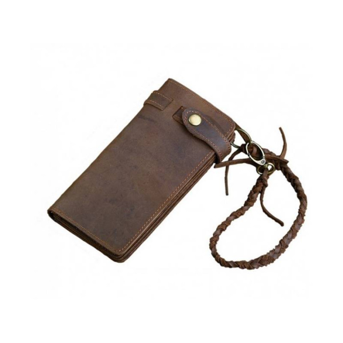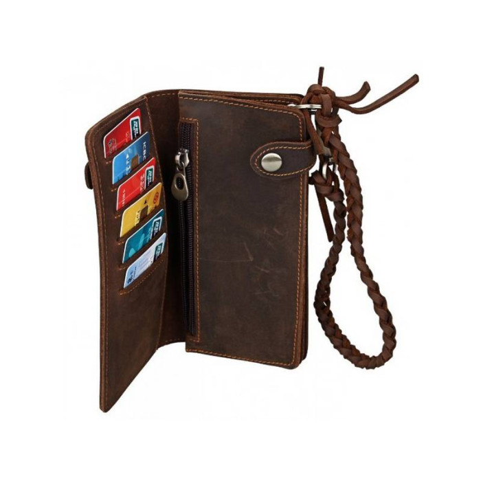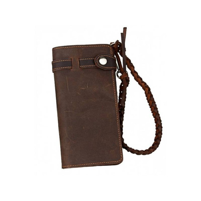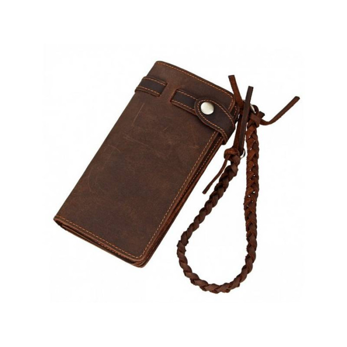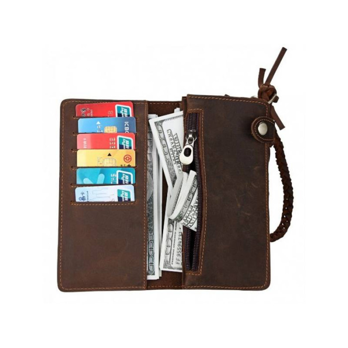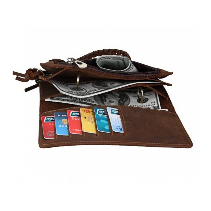 Чоловіче портмоне від Tiding Bag підійде для ділових, впевнених в собі чоловіків. Зроблене з натуральної кінської шкіри високої якості, воно має не тільки насичений глибокий коричневий колір, а й яскраву унікальну прикрасу у вигляді плетеного ремінця. Крім помітного плетіння є клапан, який надійно закриває портмане. Пормоне акуратне і не займає багато місця, при цьому в ньому є відсіки для банкнот, кишеню для монет на блискавці та відділення для банківських карт.