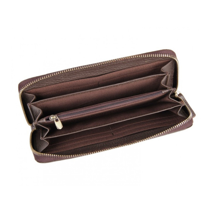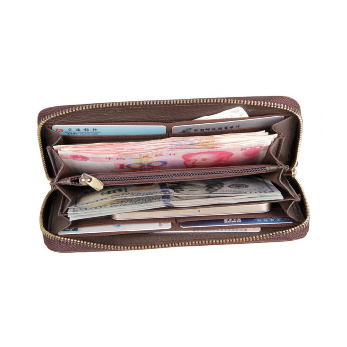 - оснащений основним відсіком, що закривається на блискавку, в якому знаходиться чотири спеціальні м'які секції, слоти для банківських або візитних карток і м'яка перегородка на замку.