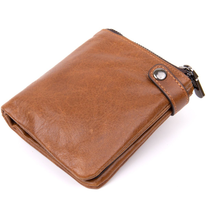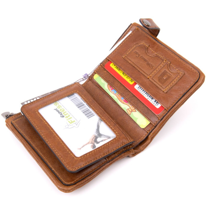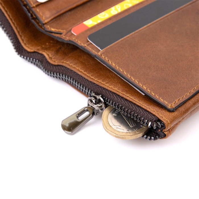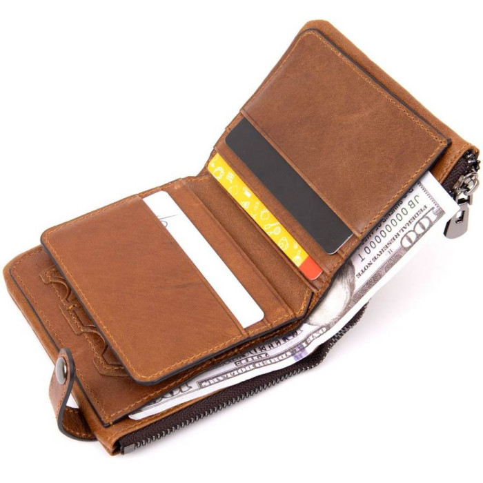 Тонке компактне портомне з натуральної шкіри з хлястиком на кнопці, закривається портмоне зверху. Виріб має велику кишеню на блискавці для купюр. Усередині досить осередків для кредиток. Виріб продумано для сучасної людини. Яка віддає перевагу карткам і носить мінімум готівки. Виріб має насичений рудий колір. Оригінальний аксесуар вигідно виділить вас з натовпу. Гаманець стане прекрасним подарунком для ваших близьких.