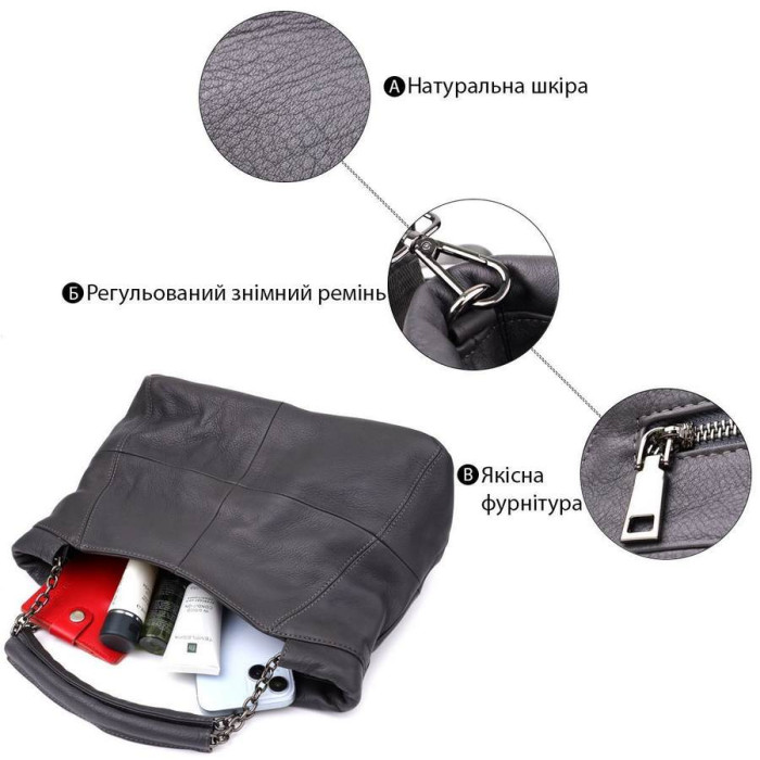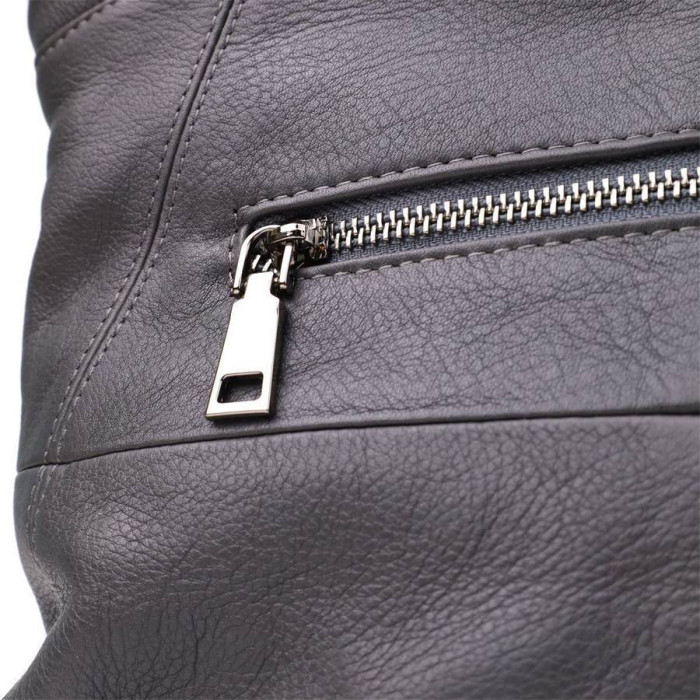 Для комфорту в носінні передбачений знімний шкіряний ремінець довжиною 118 см, який можна регулювати по довжині, вибираючи оптимальний варіант носіння - на плечі або через плече. Фурнітура виконана в кольорі срібла, що гармонійно доповнює стриманий сірий тон шкіри та надає сумці сучасного та стильного вигляду.