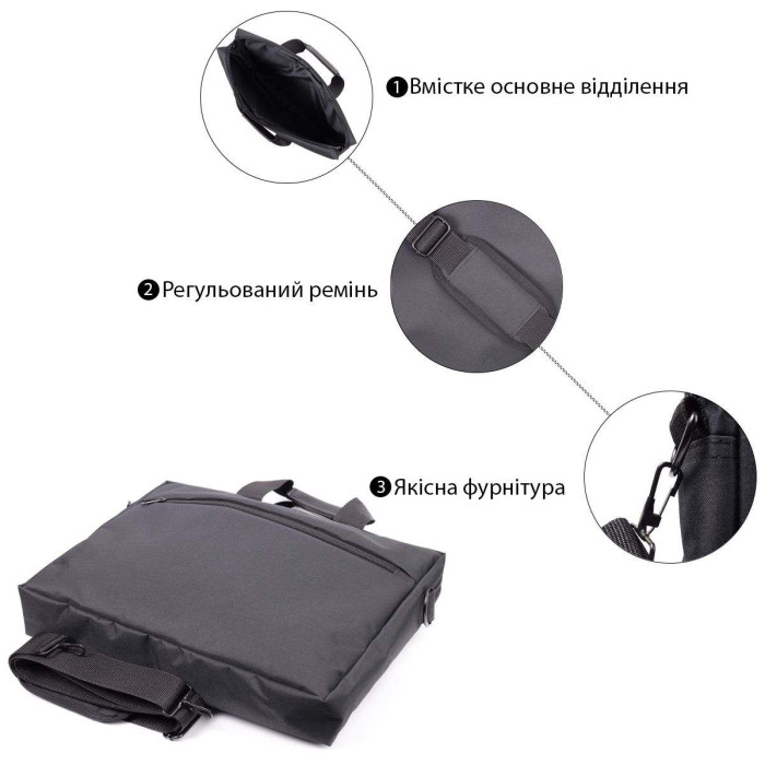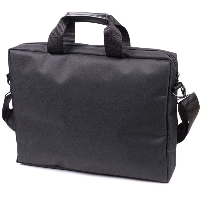 Горизонтальна ділова сумка на кожен день із якісного матеріалу – поліестеру. Виріб має оптимальний розмір, вміщує ноутбук діагоналлю до 15,6 дюймів, що в сучасному світі дуже актуально. Носити аксесуар можна в руках, для цього передбачені текстильні ручки і на плечі за допомогою надійного ременя, що знімається, з м'якою накладкою на плече, для більшої зручності. Пошита сумка акуратно, всі рядки рівні, підкладка міцна чорного кольору, надійна і якісна фурнітура. Сумка з поліестеру, дуже вигідна альтернатива шкіряним сумкам, тому що прослужить не менше, не втрачаючи свого первісного вигляду, а ціна приємно порадує.