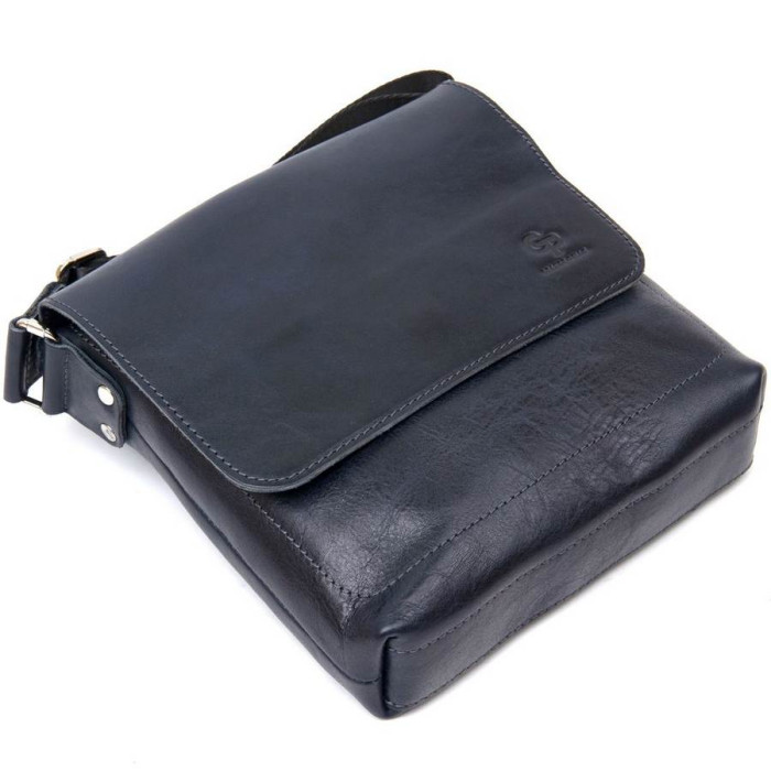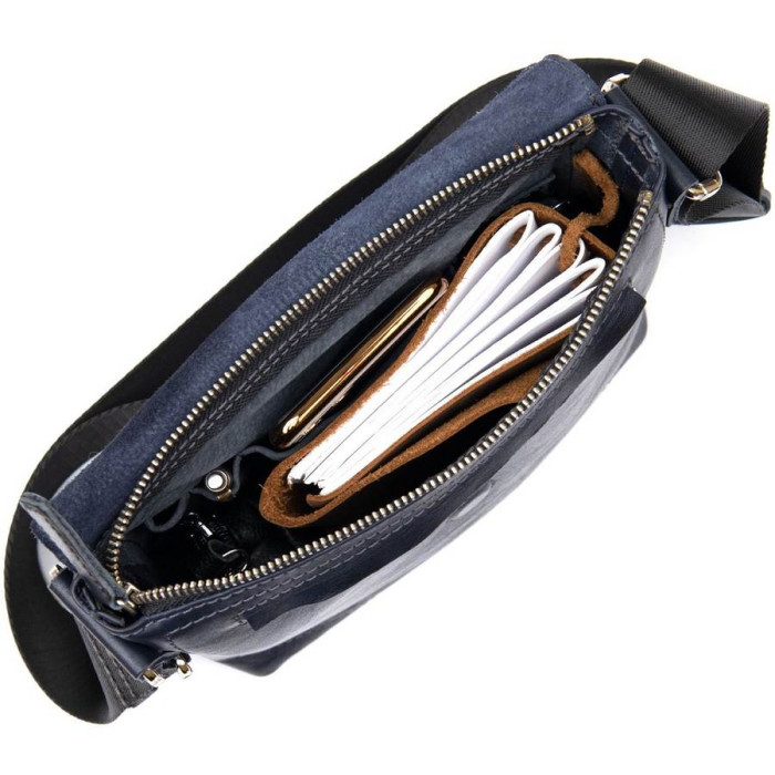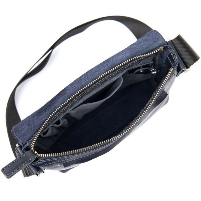 Стильний темно-синій чоловічий месенджер з висококласної натуральної шкіри, якість якої, можна оцінити навіть неозброєним поглядом. Всередині присутня одне основне містке відділення, яке закривається на блискавку і накривається клапаном на магніті. Також Вас порадують дві зовнішні кишені на блискавках для швидкого доступу до дрібниць. Упакований месенджер в фірмову сумку-чохол.