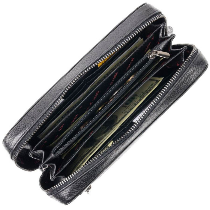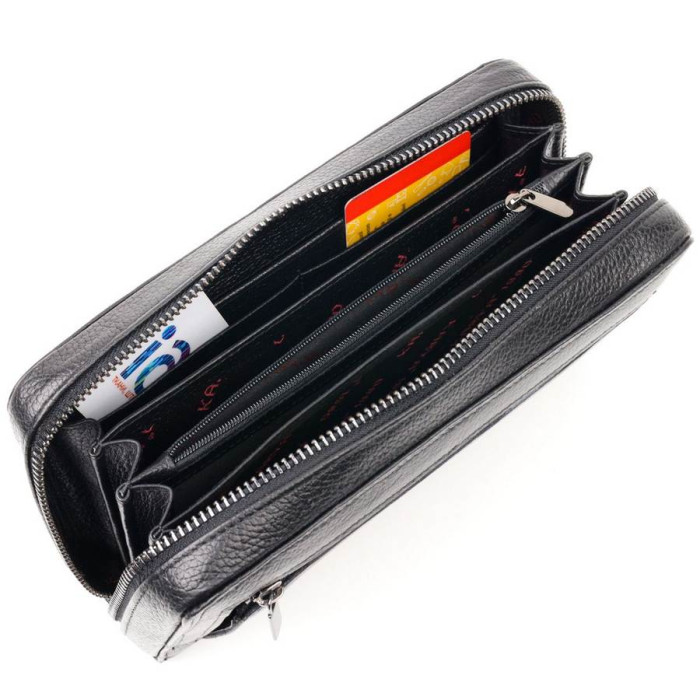 Класичний чоловічий клатч-барсетка із натуральної зернистої шкіри, в класичному чорному кольорі, з використанням добротного текстилю (внутрішня підкладка). Носиться за допомогою ремінця на зап'ясті або просто в руці. Використовується якісна фурнітура кольору темного срібла. Барсетка одночасно, компактна і функціональна, в неї можна помістити свій телефон, щоб не заважав в руках. З таким аксесуаром чоловік буде виглядати солідно і впевненим у собі.