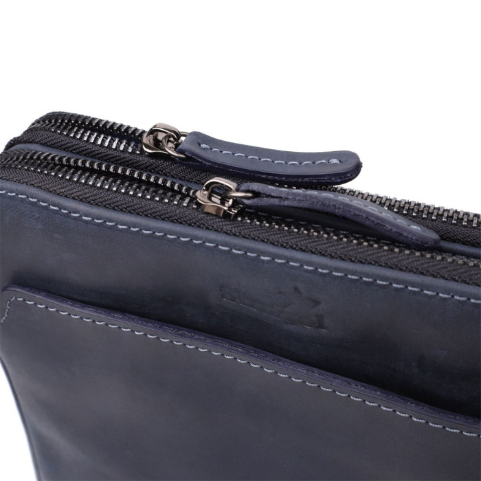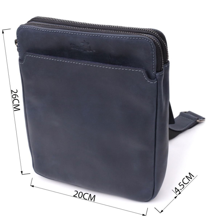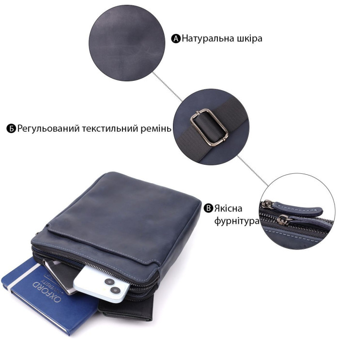 Чоловіча вертикальна сумка від українського бренду SHVIGEL виготовлена з натуральної вінтажної шкіри насиченого синього кольору. Згодом шкіра набуває благородного нальоту, що підкреслює характер виробу та його унікальність.