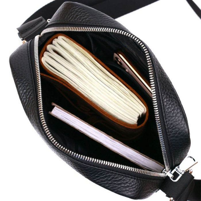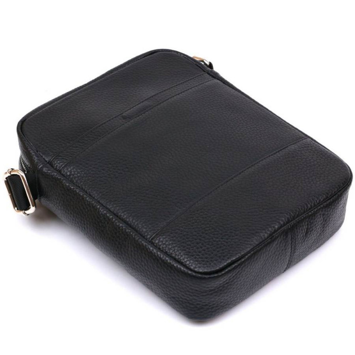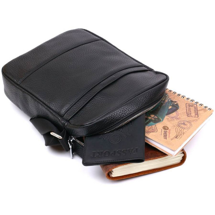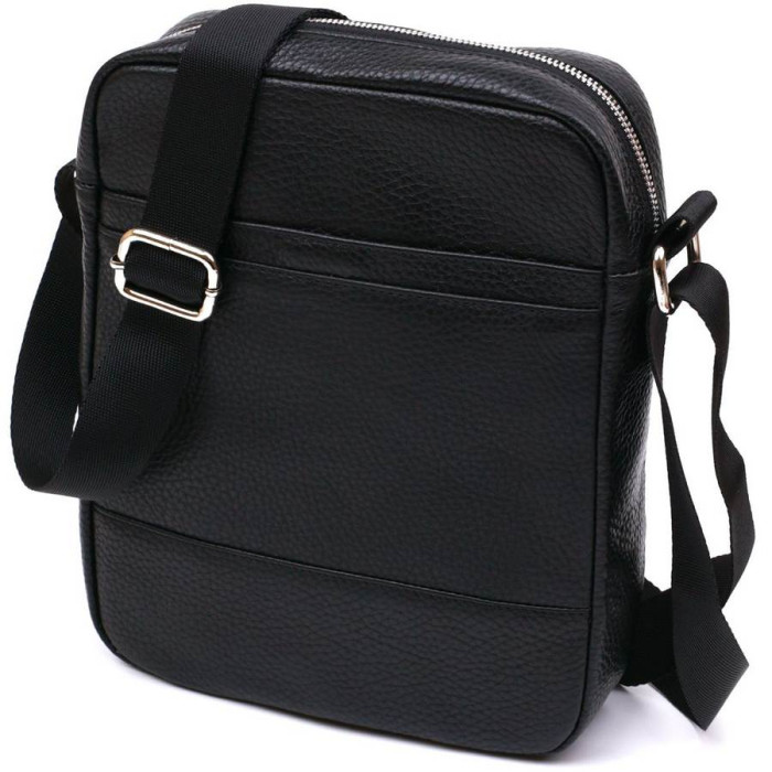 Добротна чоловіча сумка через плече у строгому дизайні без надмірностей для повсякденного використання. Має універсальний чорний колір та зернисту фактуру. Виконано модель з натуральної шкіри з відмінними експлуатаційними характеристиками. Усередині є містке відділення і потайна кишеня, на зовнішній стороні є кишеня на магніті.