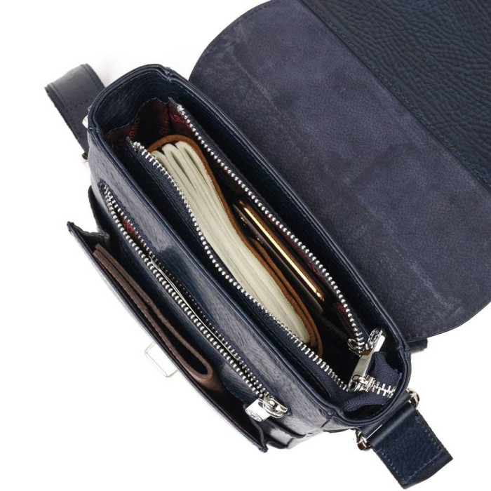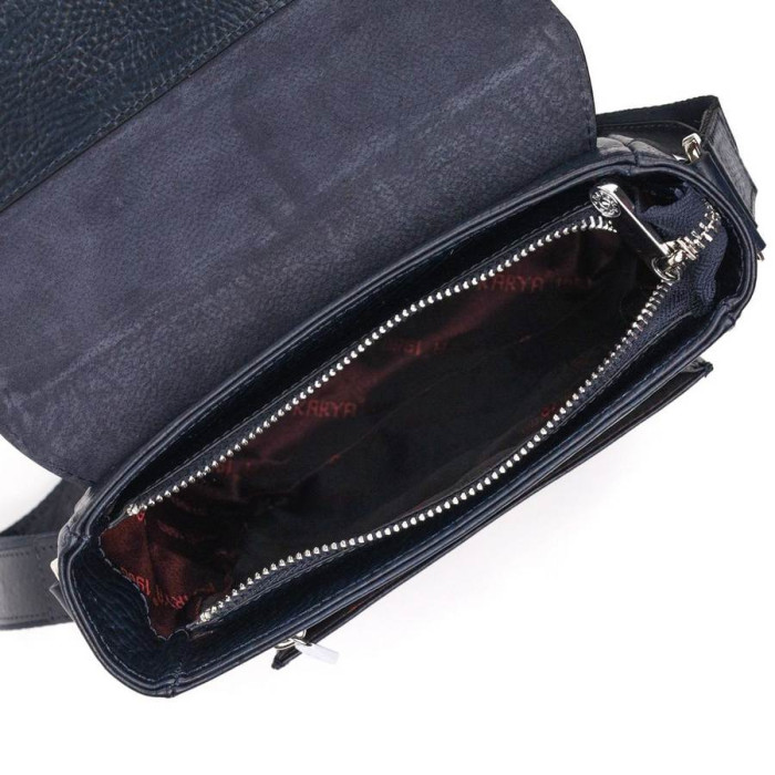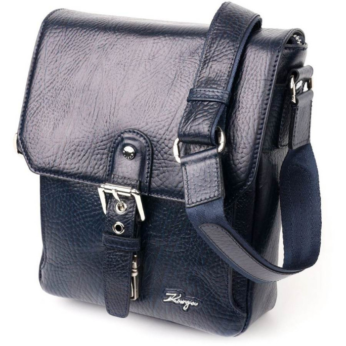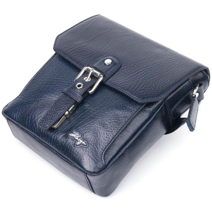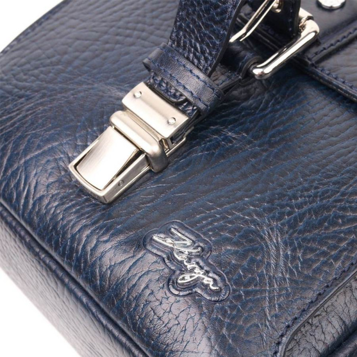Чоловіча сумка синього кольору із натуральної зернистої шкіри високої якості. Аксесуар має надійну фурнітуру сріблястого кольору та міцну підкладку. Виріб упакований у фірмовий текстильний мішок Karya. Якісна чоловіча сумка з натуральної шкіри завжди була відмінним подарунком для чоловіка будь-якого віку.