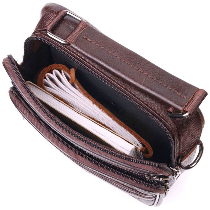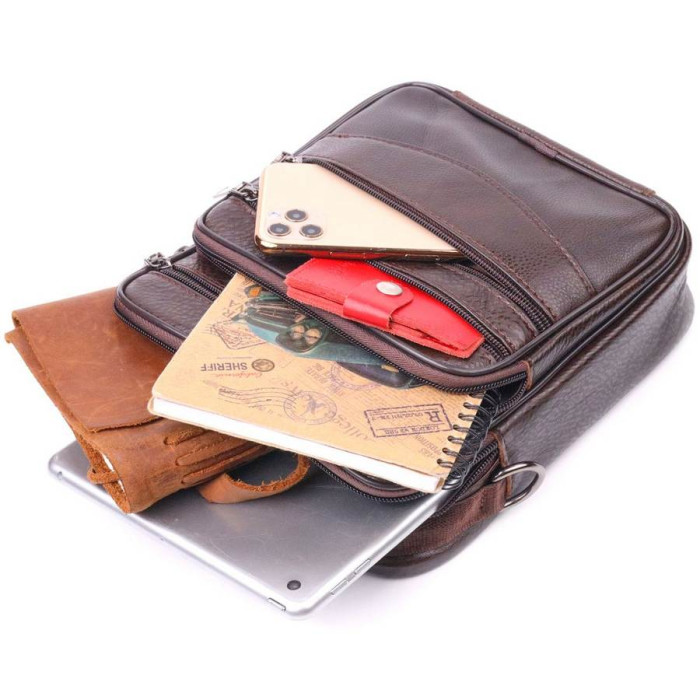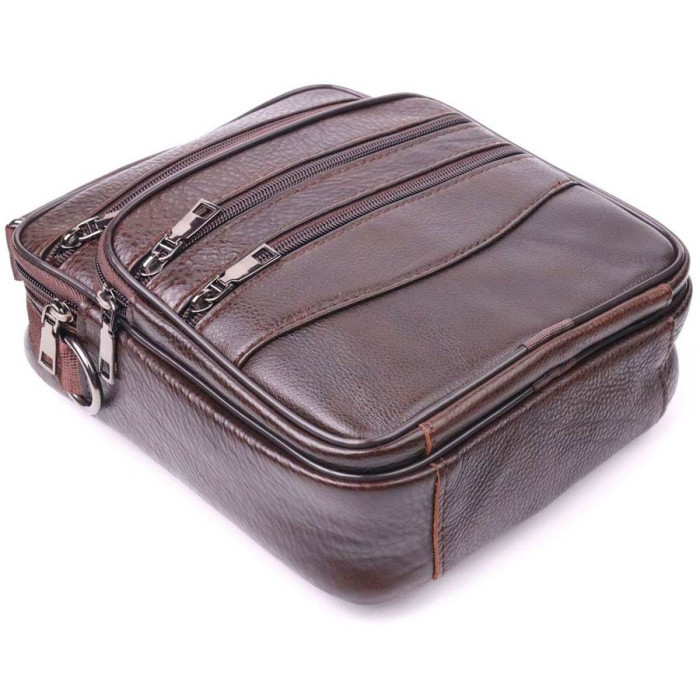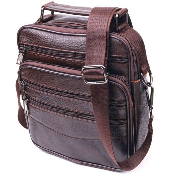 Зручна чоловіча сумка середнього розміру із натуральної шкіри. Відмінна модель, яка ідеально підійде на кожен день. У сумку з легкістю помістяться всі необхідні речі. З такою сумкою усі Ваші речі будуть в порядку, з нею також буде зручно ходити на роботу чи зустрічі. Доповнено виріб якісною фурнітурою, темно-срібло кольору. Сумка стане чудовим подарунком для близької людини.