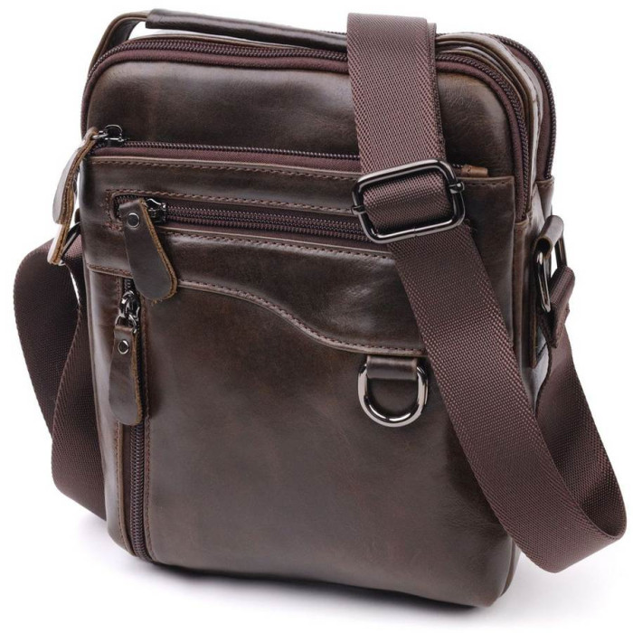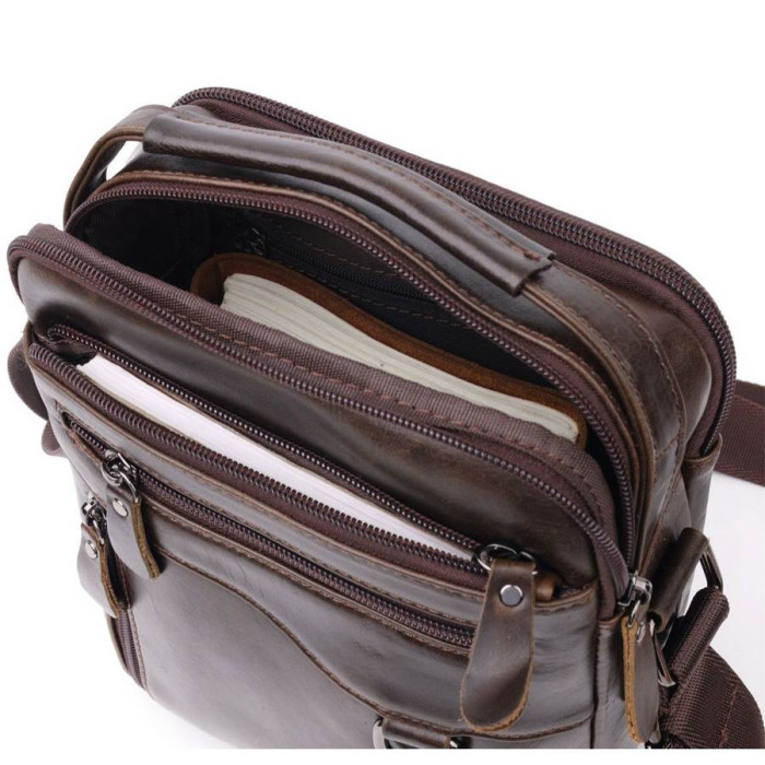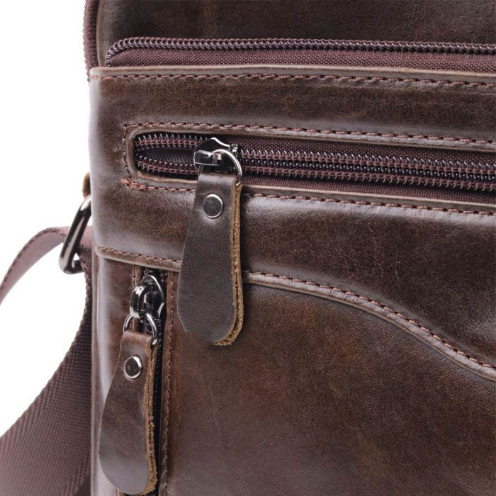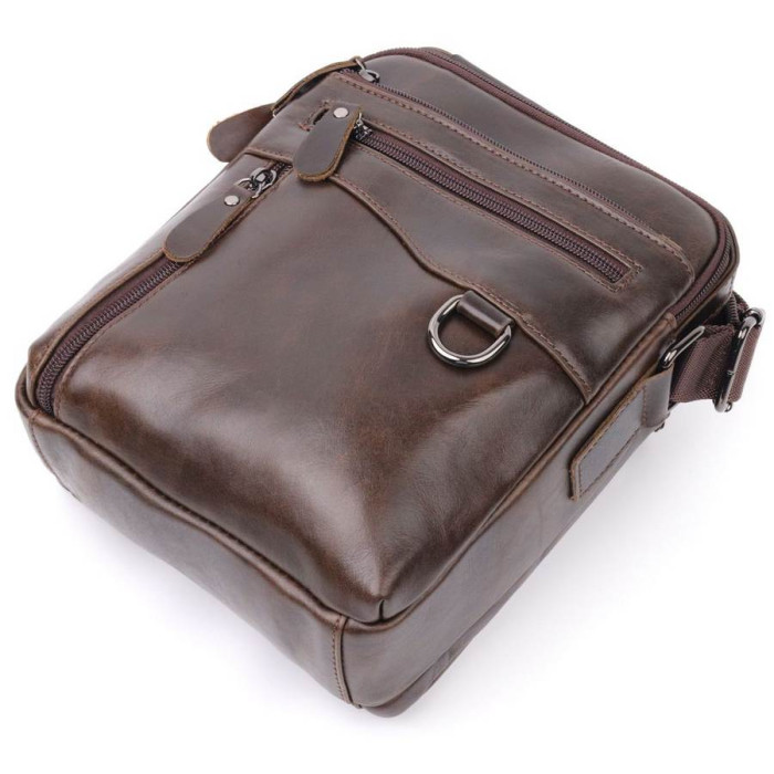 Містка чоловіча сумка компактного розміру з натуральної шкіри. У сумку з легкістю помістяться всі необхідні речі. З такою сумкою зручно ходитиме на роботу або зустрічі. Доповнено виріб якісною фурнітурою. На лицьовій стороні сумки є металева лямка для брелока, ключів або інших дрібниць. Сумка стане чудовим подарунком для близької людини.