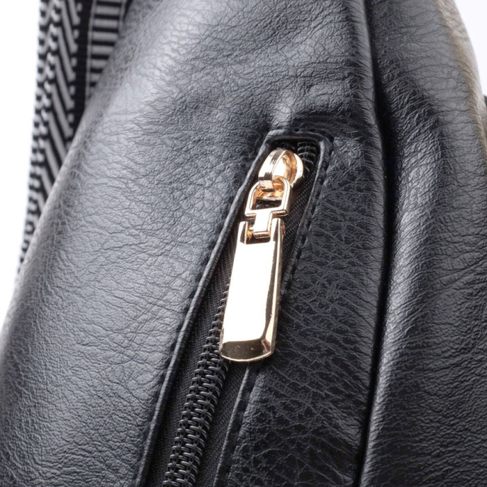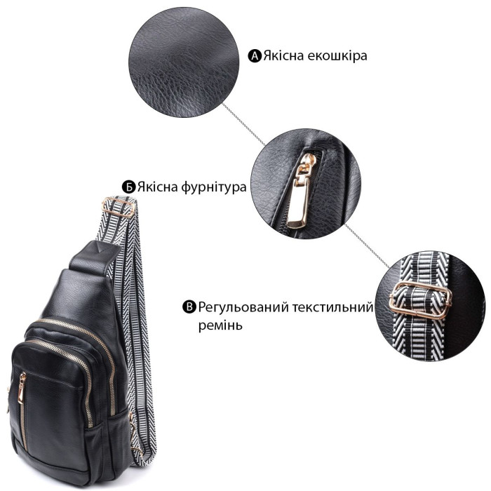 Топова слінг сумка з якісної екошкіри, в класичному чорному кольорі. Екошкіра – високоякісна альтернатива натуральному матеріалу, яка дуже стійка до тертя, до низьких температур, відмінно носиться на відміну від інших штучних матеріалів, а також має гіпоалергенний склад на відміну від натуральної шкіри. Дана модель складається з одного основного відділення, яке закривається на блискавку і в якому знаходиться потайна кишеня, а також трьох кишень зовні та одного отвору для кабелю або навушників, що дуже зручно в сучасному світі. Основною фішкою моделі є зручний регульований плечовий ремінець із стильним візерунком. Відмінний варіант сумки на кожен день та у будь-який сезон.