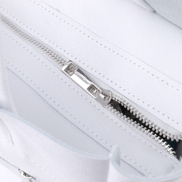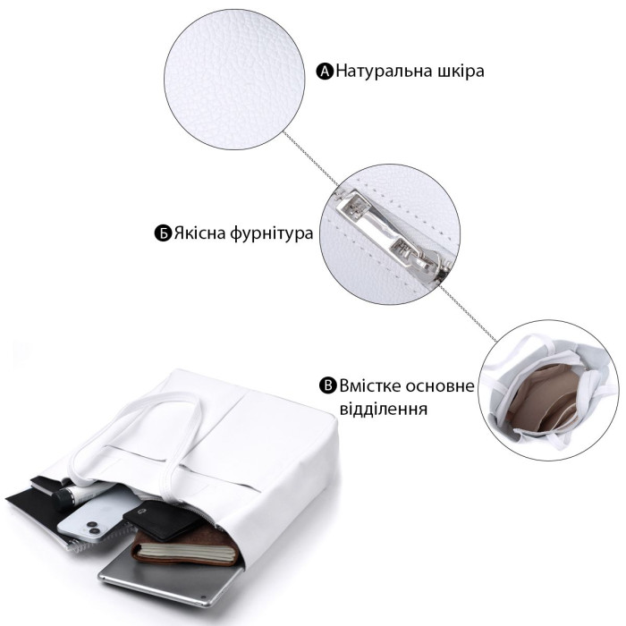 Містка жіноча сумка для тих, хто завжди носить із собою величезну кількість речей. Таку сумку можна спокійно носити на роботу, в неї добре поміщаються всі особисті речі і папки з документами. Також таку модель зручно брати із собою у подорожі та виглядати завжди стильним та елегантним. Колір моделі – білий, фактура – зерниста. Матеріал виконання – натуральна шкіра з високими показниками стійкості до зношування. Для перенесення використовуються дві міцні надійні ручки. Сумка має знімне ущільнене дно прямокутної форми, щоб надати за бажанням більш чітких форм аксесуару. Фурнітура срібного кольору – стійка не змінює свій колір у процесі носіння. Аксесуар чудово поєднується з усіма стилями в одязі та може стати чудовим подарунком на будь-яке свято.