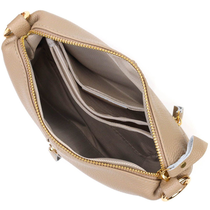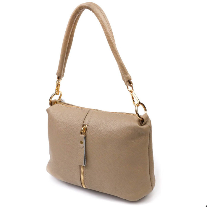 Відмінна жіноча сумочка з натуральної шкіри високої якості. Виріб дуже зручний, можна носити на плечі, через плече та в руці. Модель доповнена фурнітурою кольору золота. Аксесуар має одне основне відділення в якому три кишеньки - дві на блискавці та одна відкритого типу, а також кишеню на блискавці зовні на тильній стороні та вертикальну кишеню-обман на лицьовій стороні. Модель закривається на блискавку. Ідеальний варіант для будь-якої дівчини на будь-який сезон.