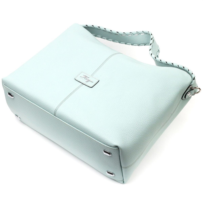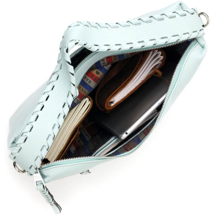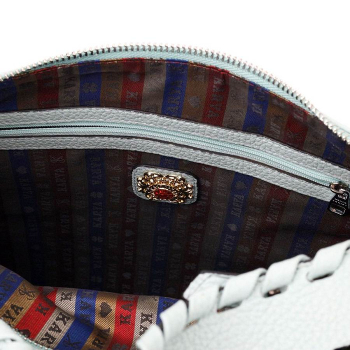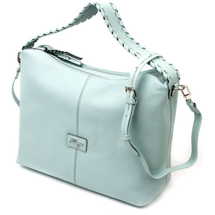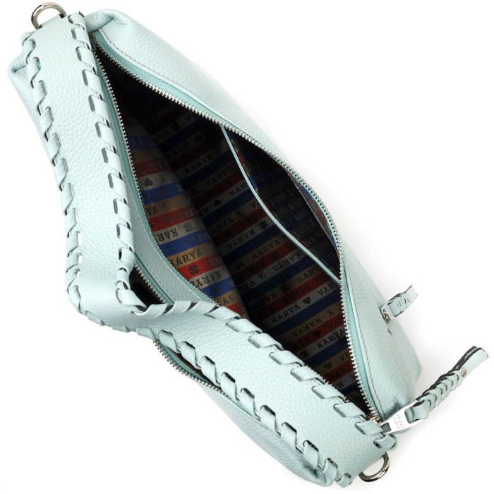Красива містка сумка жіноча з натуральної зернистої шкіри, незвичайного блакитного кольору. Сумка практична та функціональна в експлуатації, якісна фурнітура сріблястого кольору не тільки доповнює стильний дизайн сумки, але й захищає виріб. Аксесуар упакований у фірмовий текстильний мішок Karya. Сумка з натуральної шкіри завжди буде чудовим подарунком будь-якій жінці.