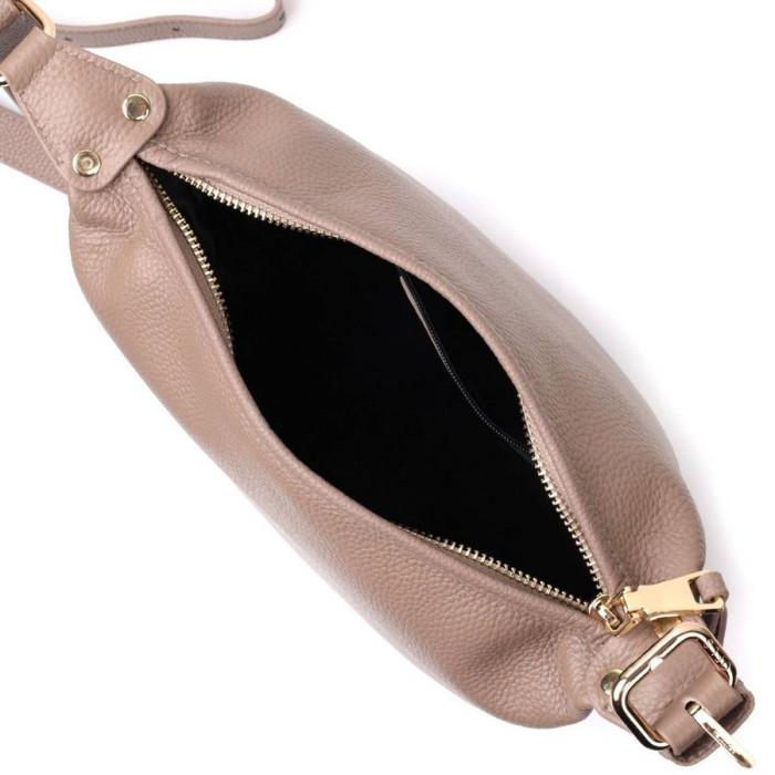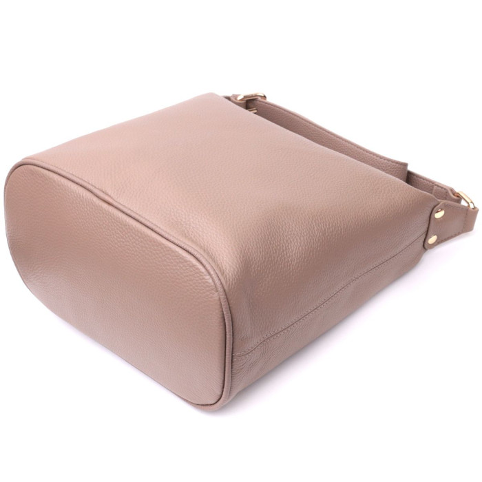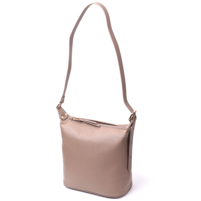 Жіноча стильна вертикальна сумка з твердим дном з натуральної м'якої шкіри, яка дуже добре показала себе в експлуатації. Аксесуар складається з основного відділення, потайної кишені на блискавці та кишені відкритого типу. Носити сумку можна на плечі та через плече, для цього є шкіряний незнімний регульований ремінь. У виробі використано якісну фурнітуру кольору жовтого золота. Чудовий варіант сумки на кожен день.