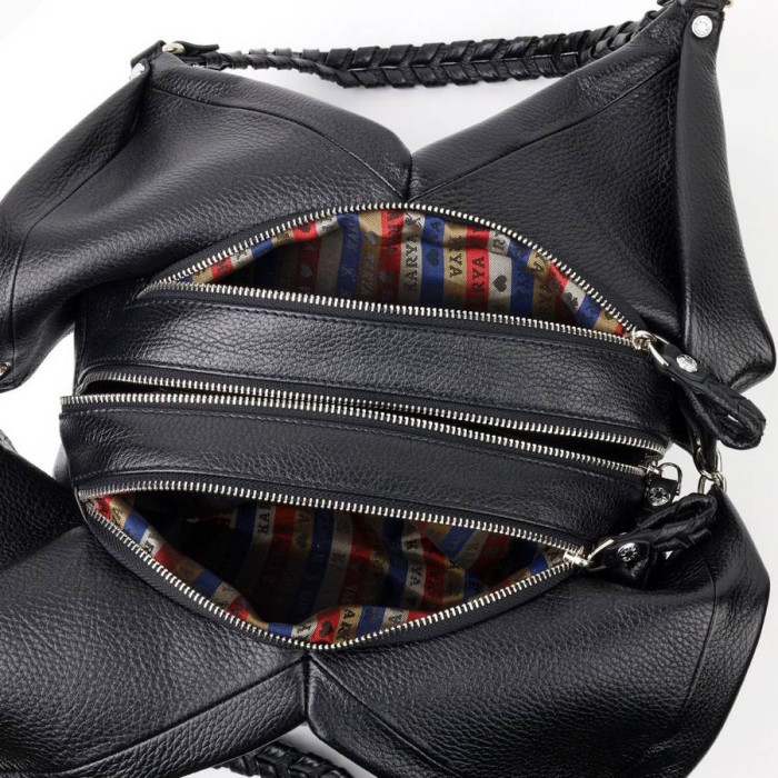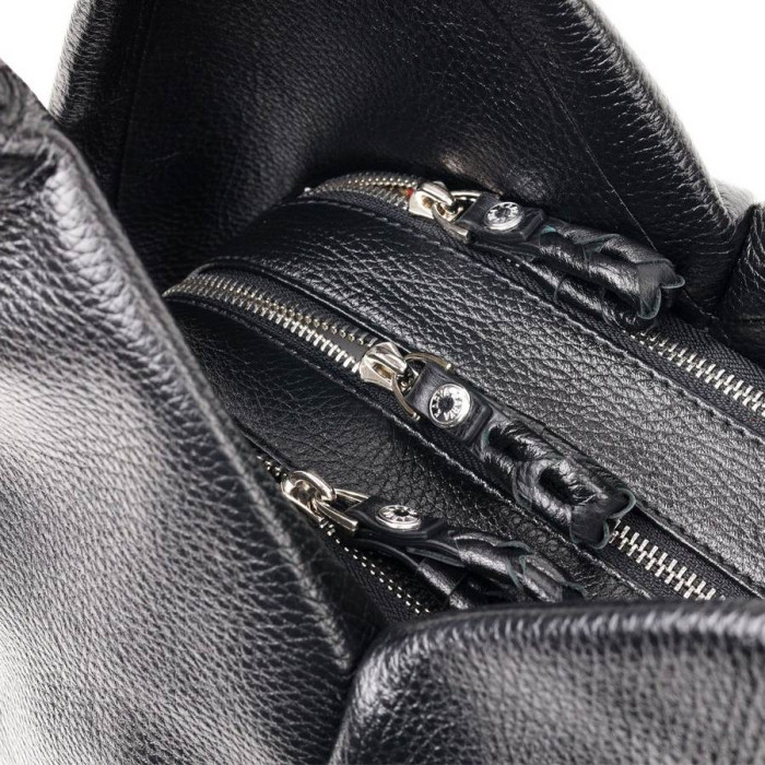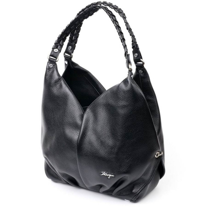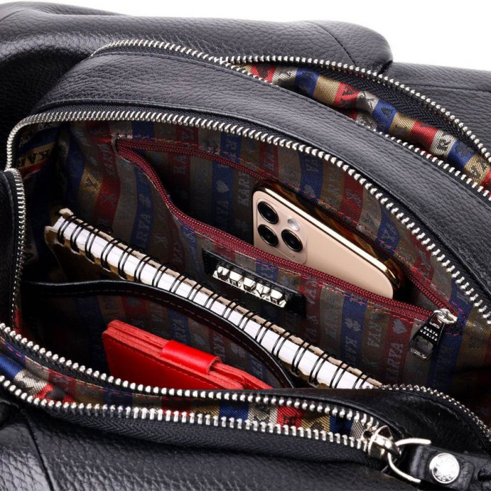 Практична сумка жіноча середнього розміру з натуральної шкіри, в оригінальному дизайні і класичному чорному кольорі. Фурнітура срібного кольору. Сумку зручно носити в руці, на плечі. Сумка упакована у фірмовий текстильний чохол Karya. Сумка з натуральної шкіри завжди буде чудовим подарунком будь-якій жінці.