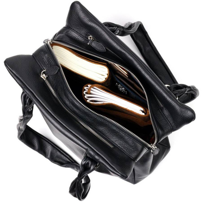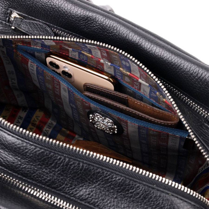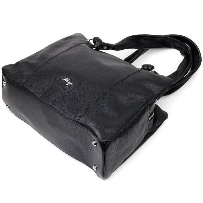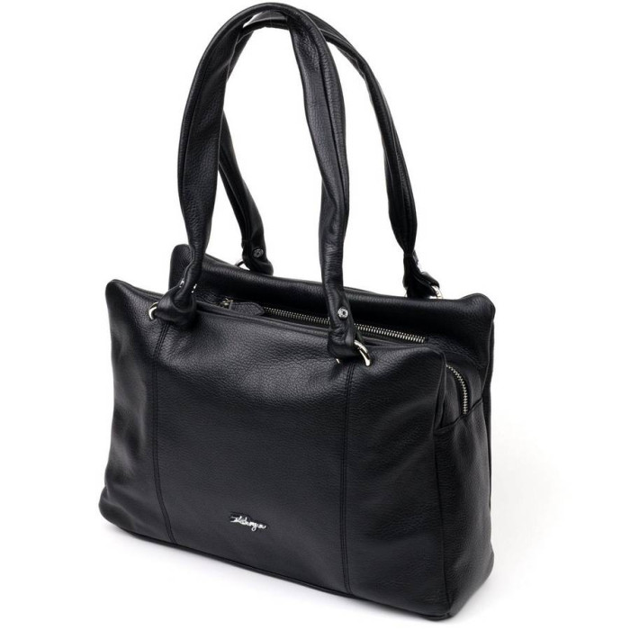Сувора жіноча сумка в діловому стилі з натуральної шкіри, в оригінальному дизайні та класичному чорному кольорі. Фурнітура срібного кольору. Сумку зручно носити у руці, на плечі. Сумка упакована у текстильний чохол. Сумка з натуральної шкіри завжди буде чудовим подарунком будь-якій жінці.