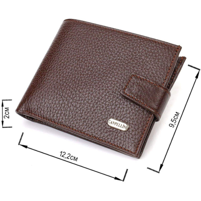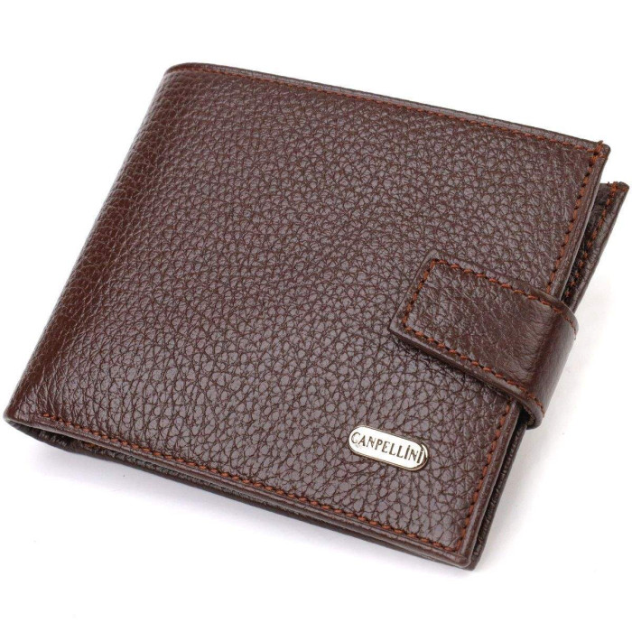 Стильне чоловіче портмоне середнього розміру з натуральної зернистої шкіри. Аксесуар має основне відділення для купюр з кишенею-перегородкою на блискавці, три осередки для карток, дві кишені під сіточкою, дві прилеглі кишені та монетницю. Гаманець складається навпіл, закривається хлястиком на кнопку. На лицьовій стороні в правому нижньому кутку розташований металевий логотип компанії виробника. Багатофункціональний чоловічий гаманець з дуже міцної шкіри чудовий вибір подарунка для солідного чоловіка.