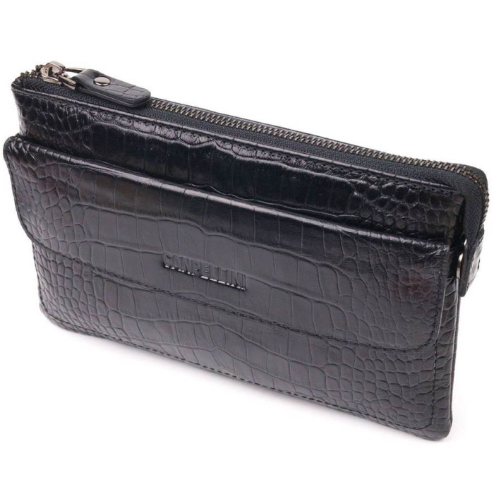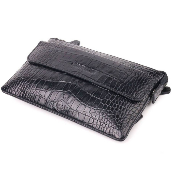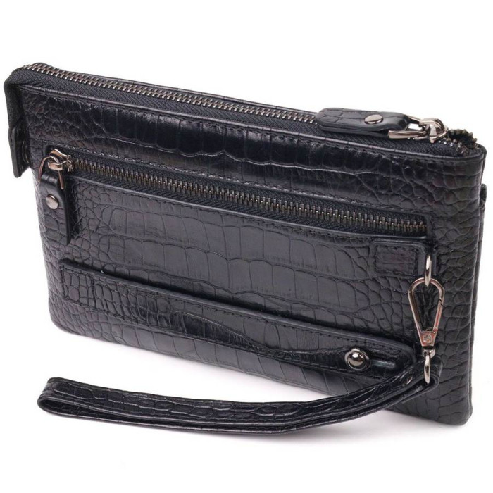 Оригінальний клатч для чоловіків з натуральної фактурної шкіри з тисненням під крокодила. Аксесуар має одне основне відділення, всередині якого дві бічні кишені, відкритого та закритого типу та три осередки для кредитних карток. Зовні у виробі розташовані дві кишені, одна під клапаном на лицьовій стороні, інша на блискавці, на тильній стороні. Внизу аксесуара є ремінець для носіння на руці, що дуже зручно у використанні, також є кистьовий ремінь, що знімається. У барсетку ви можете покласти все необхідне і все буде під рукою.