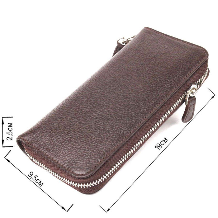 Місткий жіночий гаманець, з натуральної шкіри. Аксесуар має три основні відділення, в які поміщаються купюри всіх номіналів, дві перегородки, одна з них на блискавці, вісім кишень для карток, дві прилеглі кишені та знімний кистьовий ремінь. Закривається аксесуар на блискавку. Відмінний аксесуар, надійний виробник, який прослужить дуже довго.