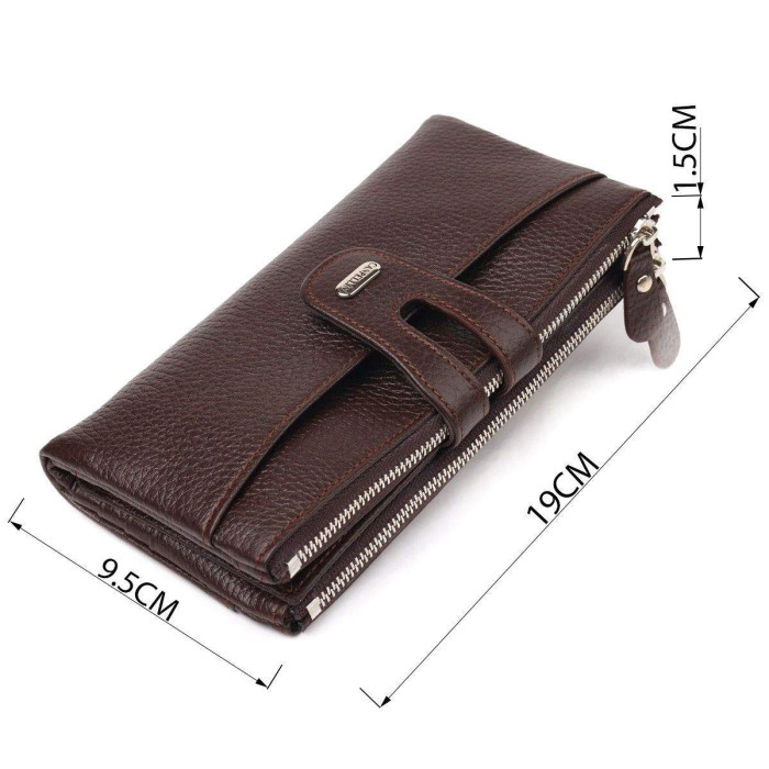 Місткий жіночий гаманець із натуральної зернистої шкіри. Аксесуар має два широкі основні відділення, в які поміщаються купюри всіх номіналів, дві монетниці, двадцять чотири кишені для карток, дві відкриті кишені зовні та одне прозоре віконце для документів. Закривається аксесуар хлястиком на кнопку. Якщо Ви хочете порадувати себе та здивувати близьких, то неодмінно купуйте шкіряні аксесуари в нашому магазині, якість і ціна Вас однозначно порадує.