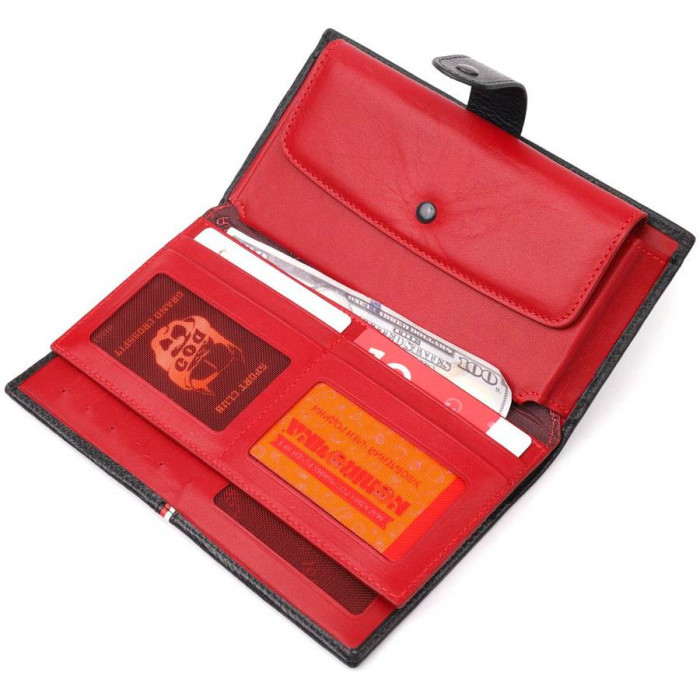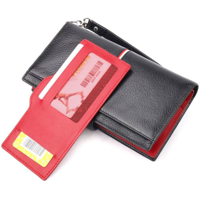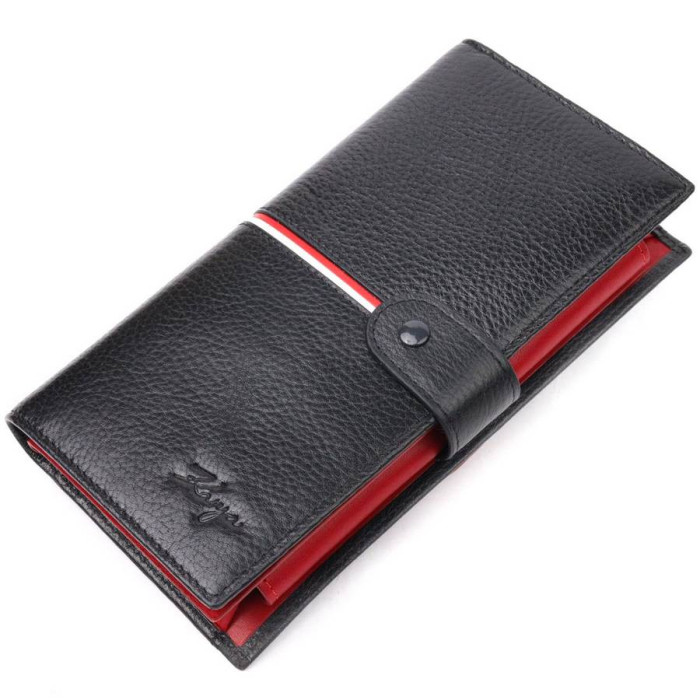 Стильний чоловічий клатч з натуральної шкіри, в класичному чорному кольорі зовні та червоному всередині, з використанням добротного текстилю (внутрішня підкладка). Носиться за допомогою ремінця на зап'ясті або просто в руці. Має декоративну вставку червоно-білого кольору. Тип фіксації в клатчі: хлястик із металевою кнопкою. Для зручності в носінні гаманець укомплектований зап'ястковим ремінцем. Дуже гідна модель вертикального формату. З таким аксесуаром чоловік буде виглядати солідно і впевненим у собі.