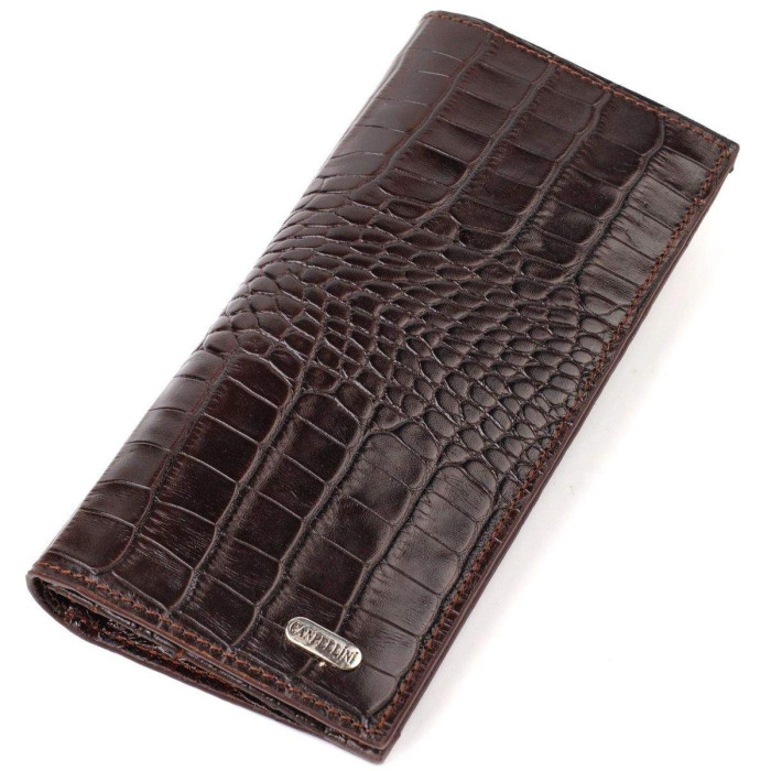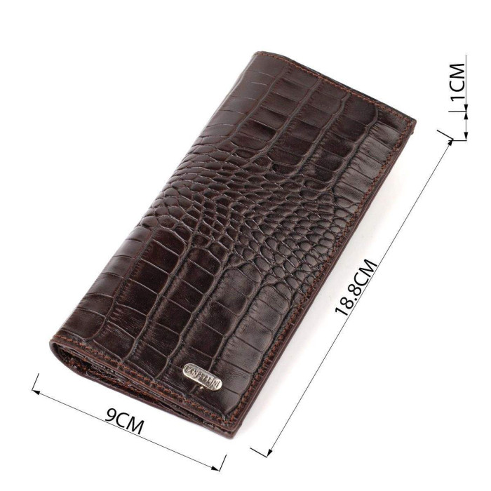 Вертикальний вузький чоловічий гаманець із натуральної шкіри із тисненням під крокодила. Аксесуар має одне основне відділення в яке поміщаються купюри всіх номіналів, одинадцять кишень для карток (одна під сіточкою), дві приховані кишені та кишеня на блискавці всередині. Закривається аксесуар навпіл на магніти. Купуючи шкіряний аксесуар цієї фірми, собі або на подарунок, будьте певні, що він прослужить Вам не один рік.