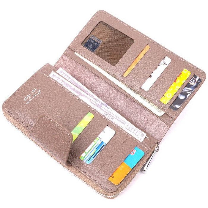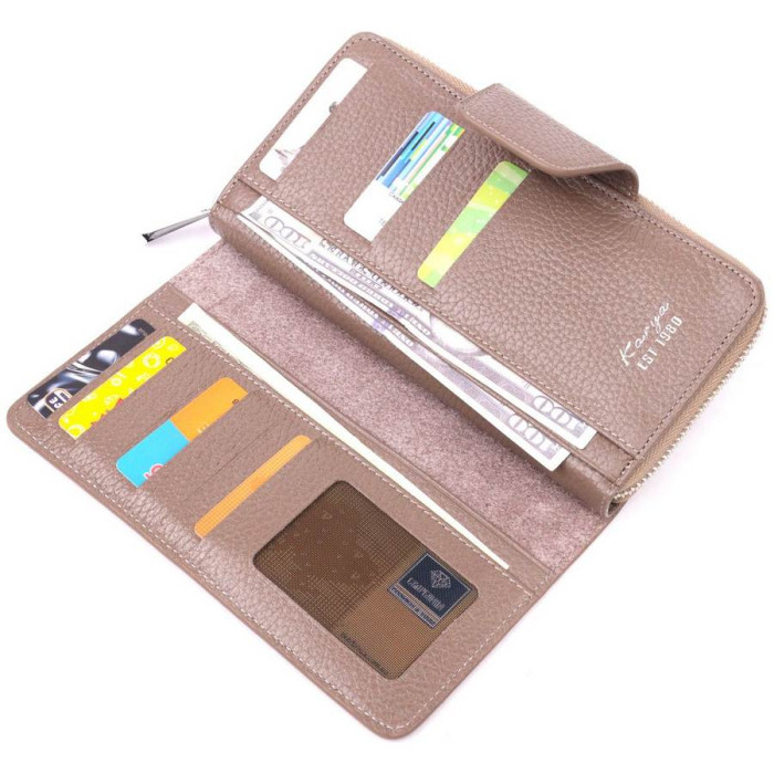 Оригінальний жіночий гаманець із якісної натуральної шкіри. Виріб складається з двох частин, перша - для купюр у нескладеному вигляді та монет, що закривається на блискавку, друга для карток та документів, закривається клапаном на магніт. Запакований аксесуар у фірмову коробку та пакет бренду. Вироби з натуральної шкіри завжди будуть чудовим подарунком для близької людини.