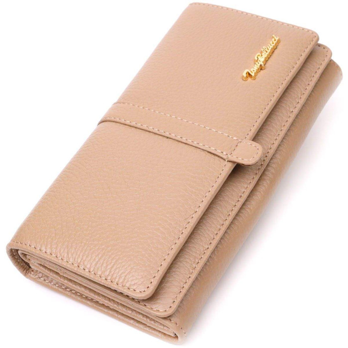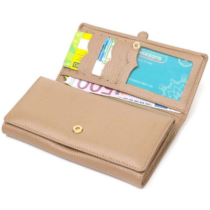 Зручний жіночий гаманець із натуральної шкіри флотар, для якої характерна міцність, зносостійкість та зерниста фактура. Аксесуар складається з чотирьох широких відділень для купюр, одинадцяти осередків для пластикових карток, двох прилеглих кишень та трьох кишень на блискавках, які можна використовувати як монетниці. У виробі використано якісну фурнітуру золотистого кольору. Закривається гаманець клапаном на кнопку. Купуючи шкіряний гаманець собі або на подарунок усі хочуть отримати якісну та стильну річ, саме такі вироби представлені у нашому магазині, а наші досвідчені менеджери допоможуть визначитися з вибором.