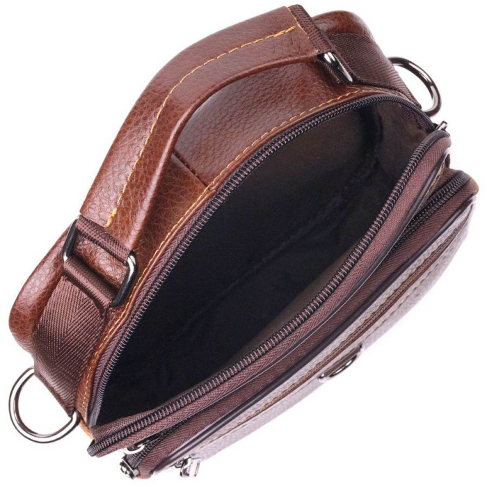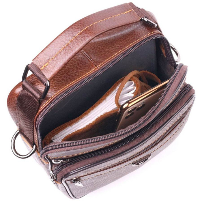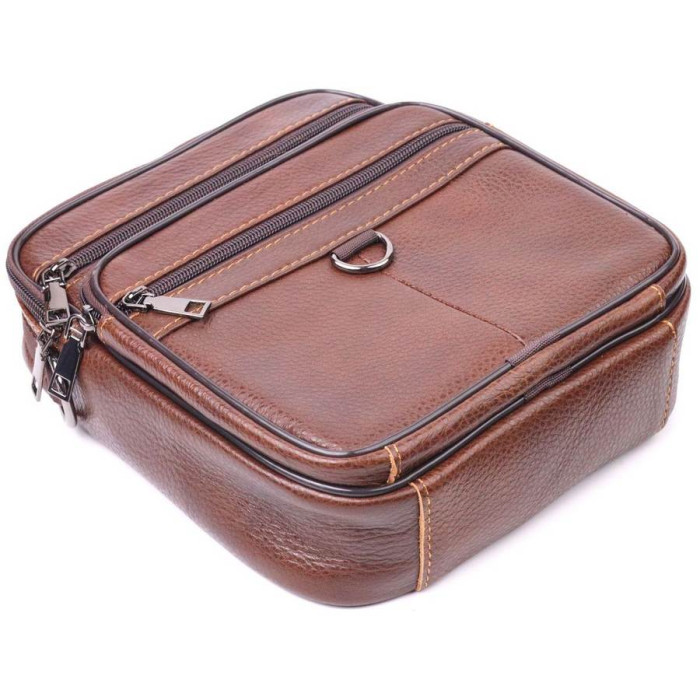 Багатофункціональна чоловіча сумка середнього розміру із натуральної шкіри. Модель, яка ідеально підійде на кожен день. В аксесуарі одне основне відділення та п'ять кишень різних розмірів, сумку можна носити як у руці, так і на плечі. У сумку з легкістю помістяться всі необхідні речі. З таким аксесуаром усі Ваші речі будуть гаразд, з ним також буде зручно ходити на роботу чи зустрічі. Доповнено виріб якісною фурнітурою, темно-срібло кольору. Сумка стане чудовим подарунком для близької людини.