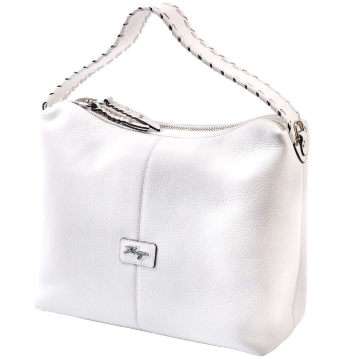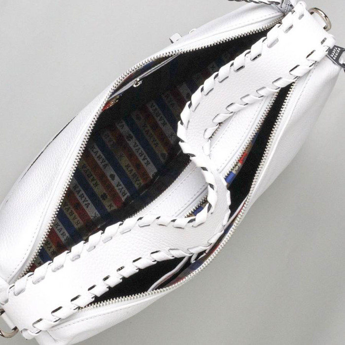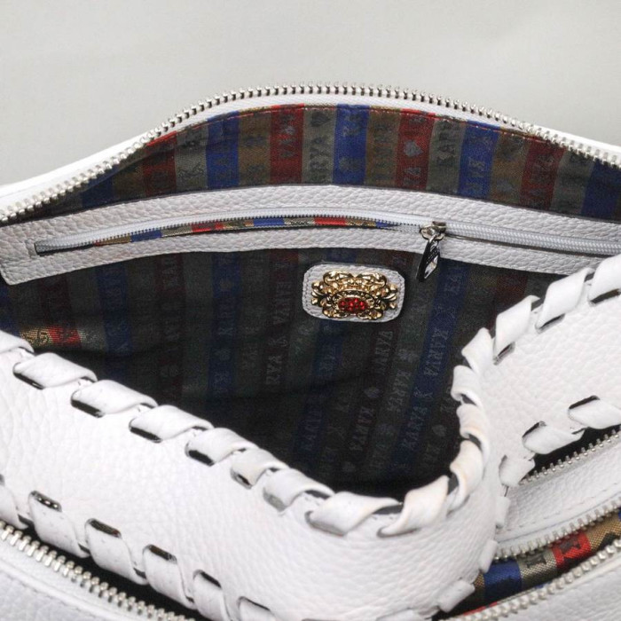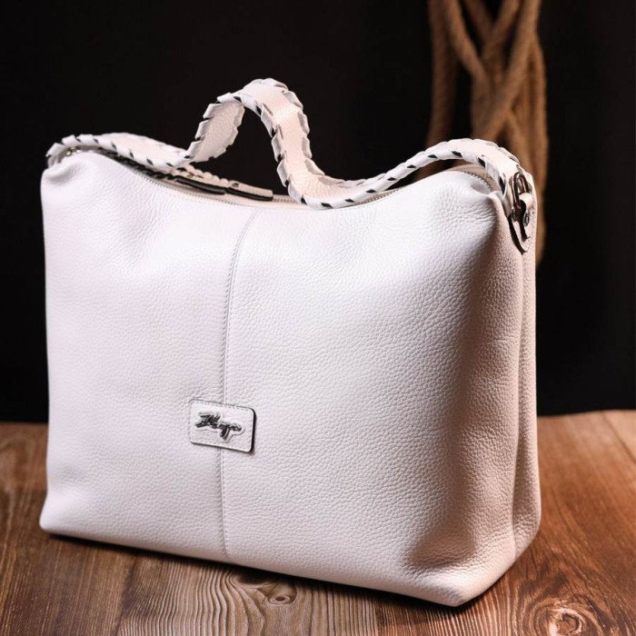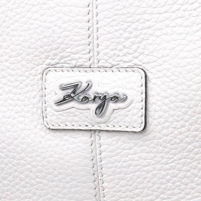 Велика та зручна жіноча сумка з натуральної зернистої шкіри, ніжного білого кольору. Містка сумка і функціональна в експлуатації, якісна фурнітура сріблястого кольору не тільки доповнює стильний дизайн сумки, але й захищає виріб. Аксесуар упакований у фірмовий текстильний мішок Karya. Сумка з натуральної шкіри завжди буде чудовим подарунком будь-якій жінці.