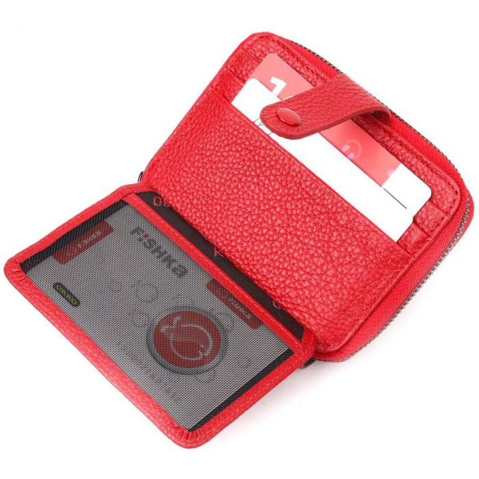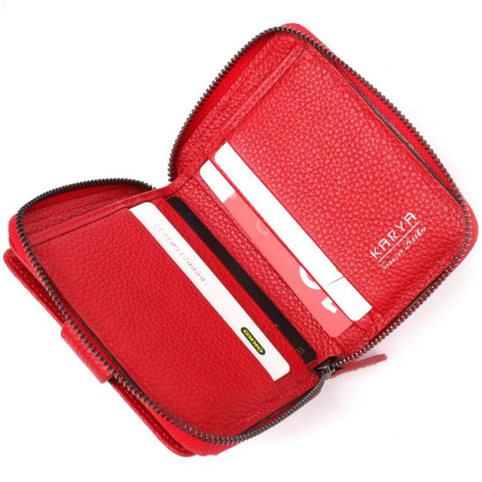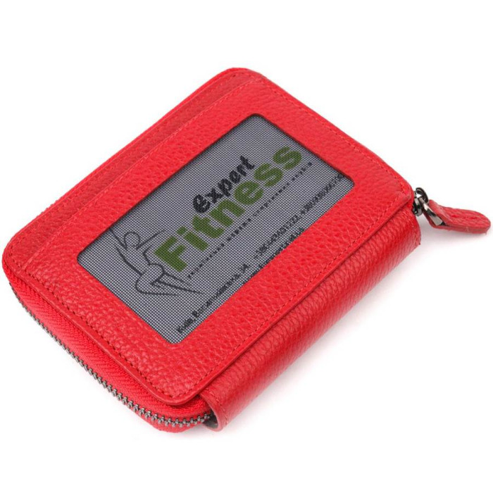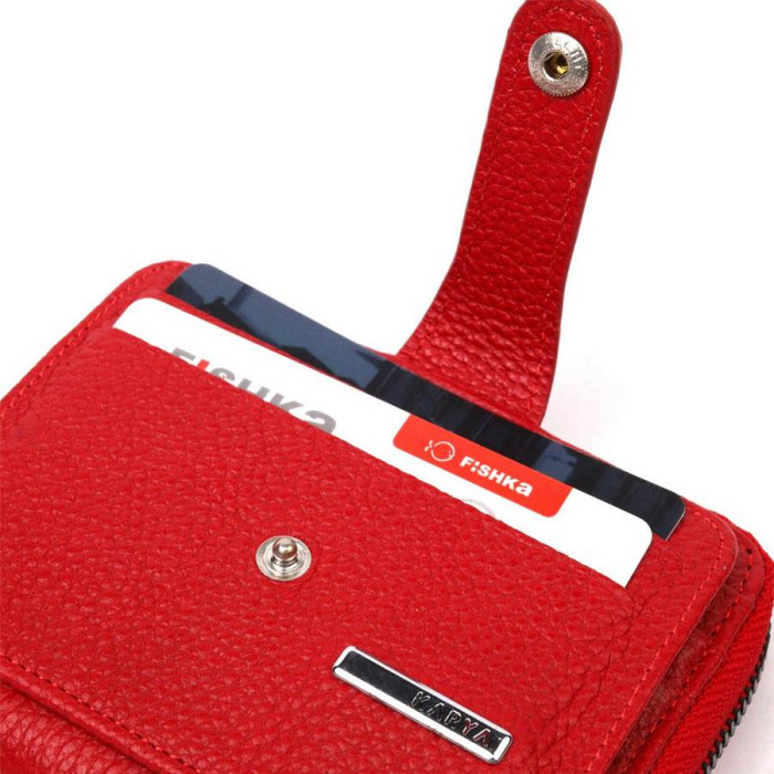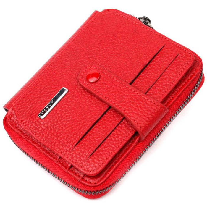 Жіночий гаманець-картхолдер із натуральної якісної шкіри, в яскравому червоному кольорі. Виріб закривається на блискавку (основне відділення) і на хлястик з кнопкою (бічне відділення). На лицьовій стороні у вигляді декору розташований металевий логотип виробника. Аксесуар упакований у фірмову коробочку. Вироби з натуральної шкіри завжди будуть чудовим подарунком для близької людини.