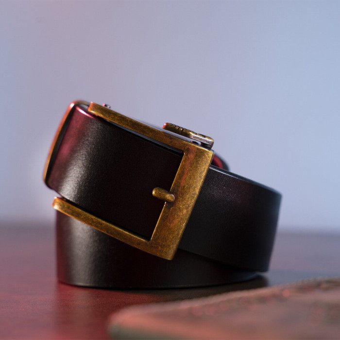Якісний шкіряний ремінь вже давно став обов'язковою частиною гардеробу кожного чоловіка. Аксесуар доповнено оригінальною пряжкою автомат з ефектом старовини кольору латуні. Пряжка додасть вашому образу нотки ретро. Ремінь зі шкіри дуже практичний і підійде на кожен день. Якщо ви перебуваєте в пошуку подарунка для чоловіка - рекомендуємо вам дану модель. У комплекті з подарунковим упакуванням ваш сюрприз стане ще більш несподіваним і приємним.