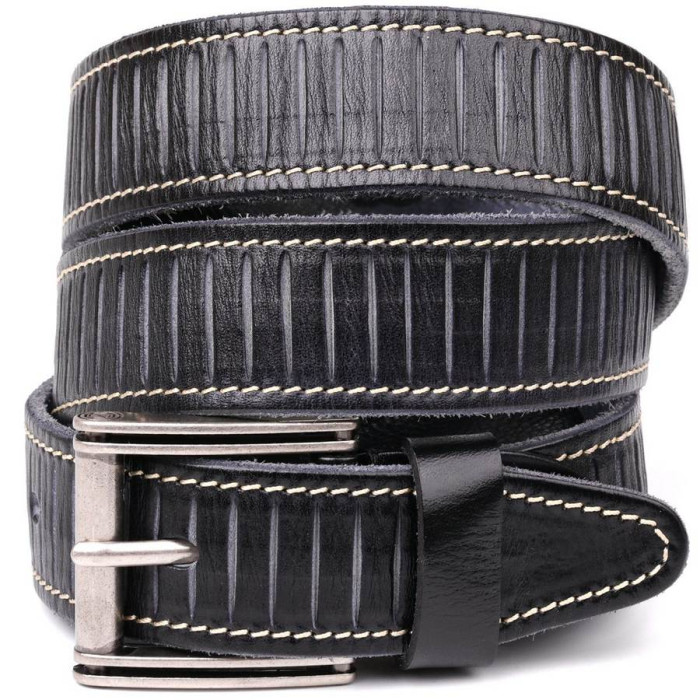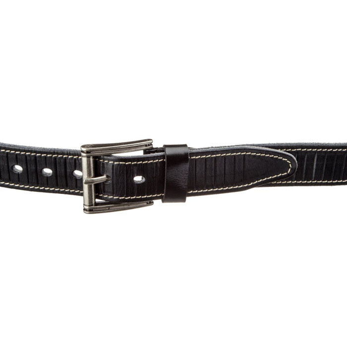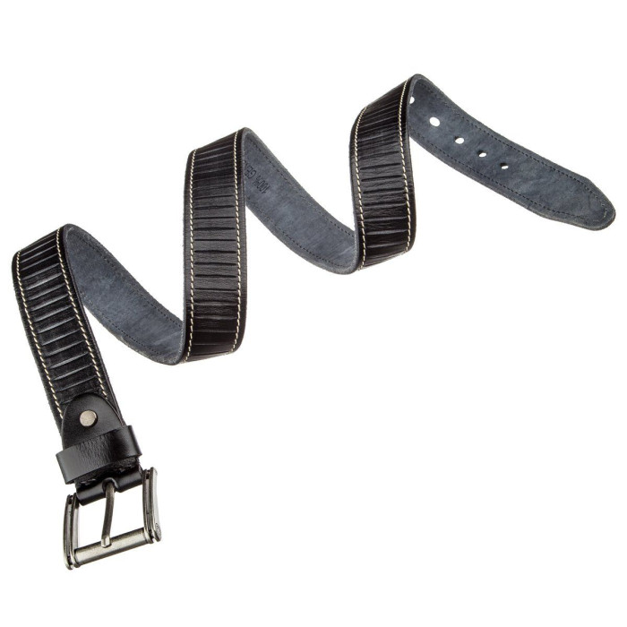 Стильний ремінь зі шкіри. Модель доповнена рівним світлим рядком по краях і оригінальним тисненням. Доповнено аксесуар солідною пряжкою з надійного металевого сплаву. Ремінь регулюється по довжині в меншу сторону, зробити це дуже просто, потрібно всього лише відкрутити гвинтик біля пряжки, відрізати зайву частину і прикрутити назад.