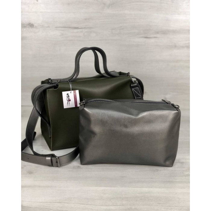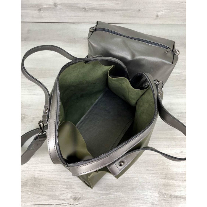 Внутри есть косметичка на подкладке и имеет два кармана: на молнии и открытый под телефон. Имеет по бокам два полукольца благодаря чему косметичку можно использовать как отдельную сумку (в сочетании с плечевым ремнем основной сумки).