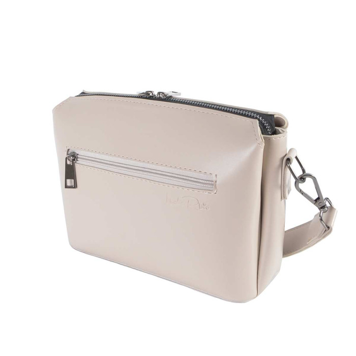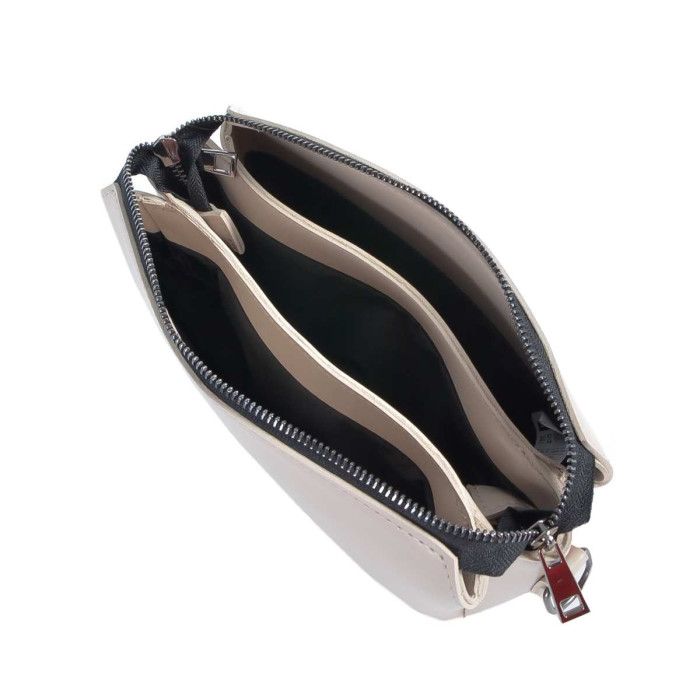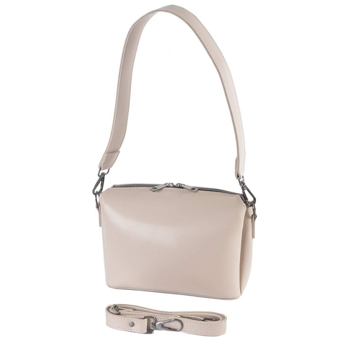 Сумка на три отделения с дополнительными карманами. Несмотря на небольшие размеры, сумочка оказалась достаточно вместительная. Все изделие закрывается на молнию. Длинный ремень с возможность регулировки длины и короткий для удобства. Ремни крепятся на карабины. На задней стенке вмонтирован карман на молнии. На дне установлены металлические ножки, которые будут защищать от повреждений.