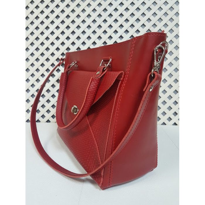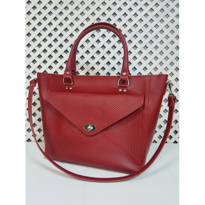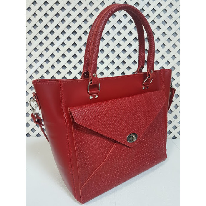 Сумка на подкладке, внутри карман на молнии. Имеется плечевой ремень и короткие ручки, которые по надобности мы можем удлинить или укоротить. Плечевой ремень двойной, не регулируется. Снаружи находится конверт-карман на поворотном замке.