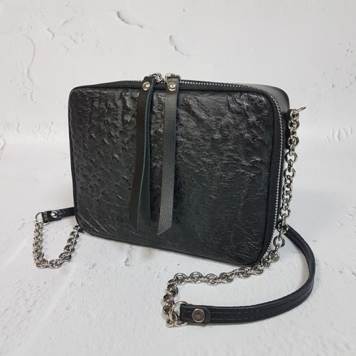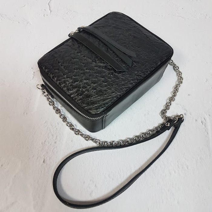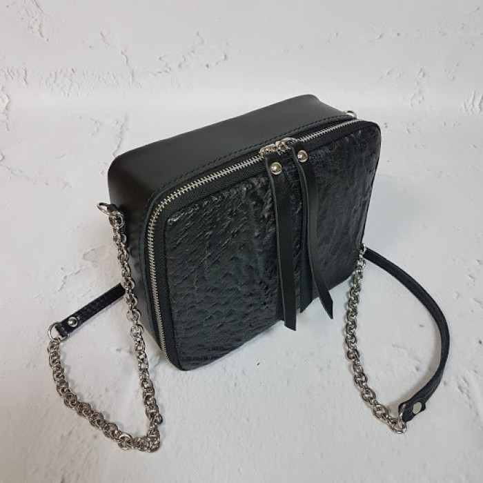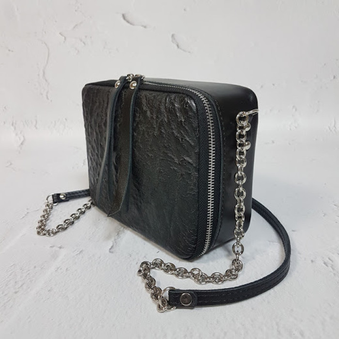 Очень оригинальная сумочка из натуральной кожи страуса "КВАДРО". Она отлично держит форму и поместит в себя все необходимое, что надо взять с собой! Внутри на подкладке. Имеет небольшой внутренний кармашек. Ремешок это плотная серебряная цепь с плечевой вставкой из кожи.