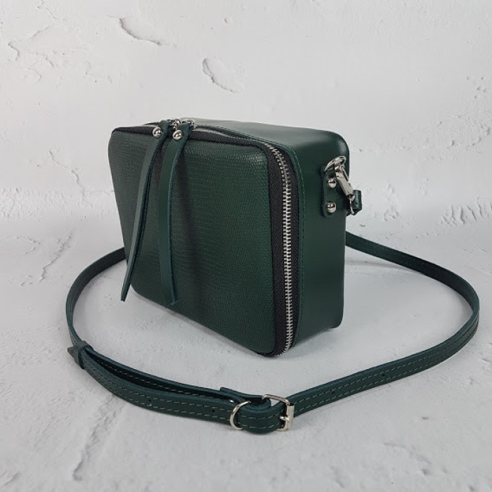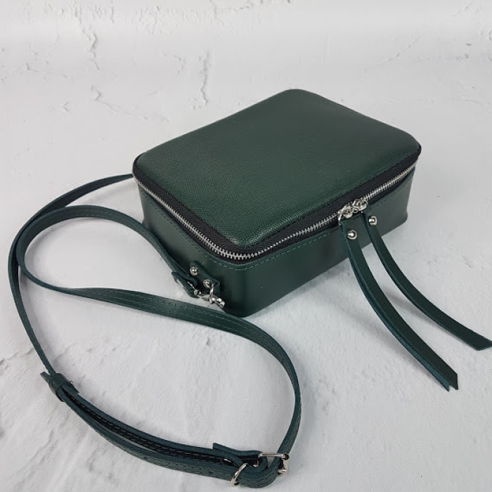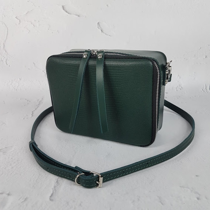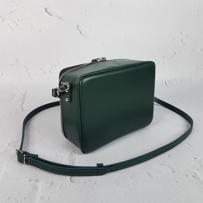 Очень оригинальная сумочка из натуральной кожи "КВАДРО". Она отлично держит форму и поместит в себя все необходимое, что надо взять с собой! Особенность этой модели в контрастной черной молнии, но если Вы хотите, мы можем сделать ее под цвет сумки. Внутри на подкладке. Имеет небольшой внутренний кармашек. Ремешок двойной с регулировкой.