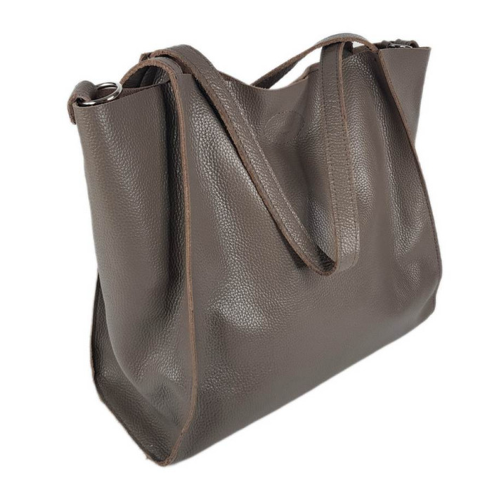 Вместительная сумка-шопер изготовлена из натуральной кожи. Внутри основного отделения есть тканевый кофр на молнии, который крепится к сумке на кнопку с помощью кожаного ремешка.