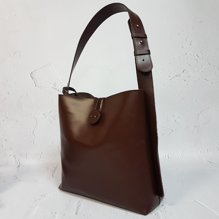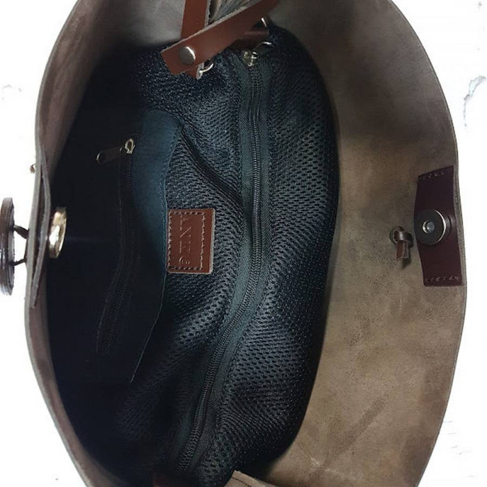 Вместительная сумка из натуральной кожи, внутри специальное отделение - футляр с карманом на молнии, которое крепится к сумке с помощью кожаного ремешка. Застегивается на декоративную пуговицу. Длина ремня регулируется..