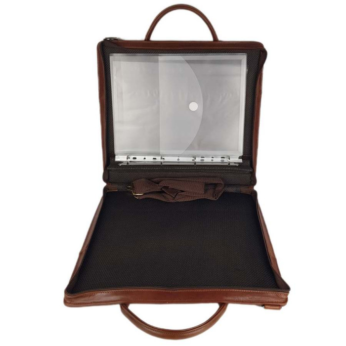 Папка для документов из натуральной кожи – это статусная вещь для делового человека! Внутри имеет кольца для файлов и др., есть крепление для планшета или небольшого ноутбука. Есть также петли для ручек и карман для визиток. В комплект прилагается текстильный регулируемый плечевой ремень