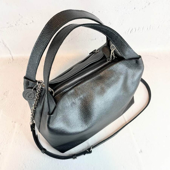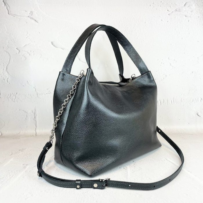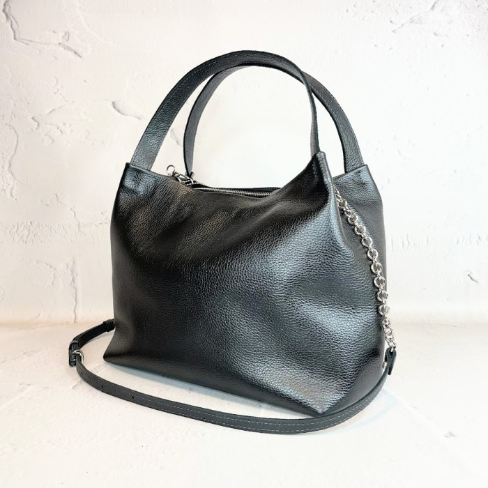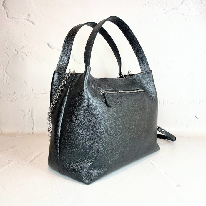 Вместительная и практичная сумочка из натуральной кожи станет неотъемлемой частью гардероба любой модницы. Эту сумку можно носить как на плече, так и в руке. На подкладке, внутри имеются два отделения, а также карман на молнии. Есть наружный карман на молнии. Плечевой ремень с декоративной цепочкой, регулируется по длине.