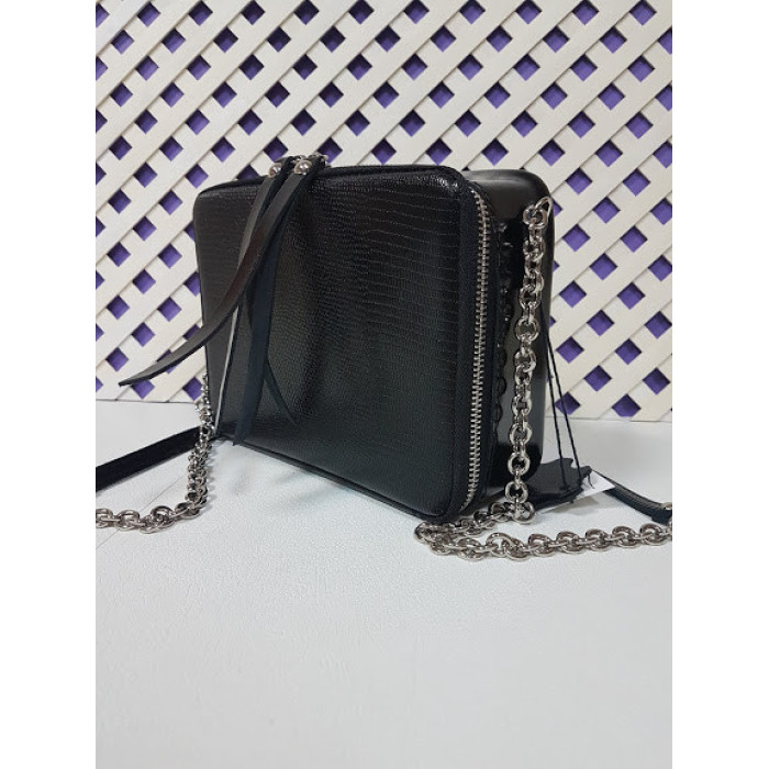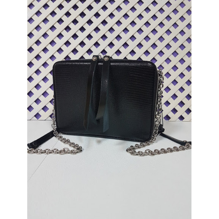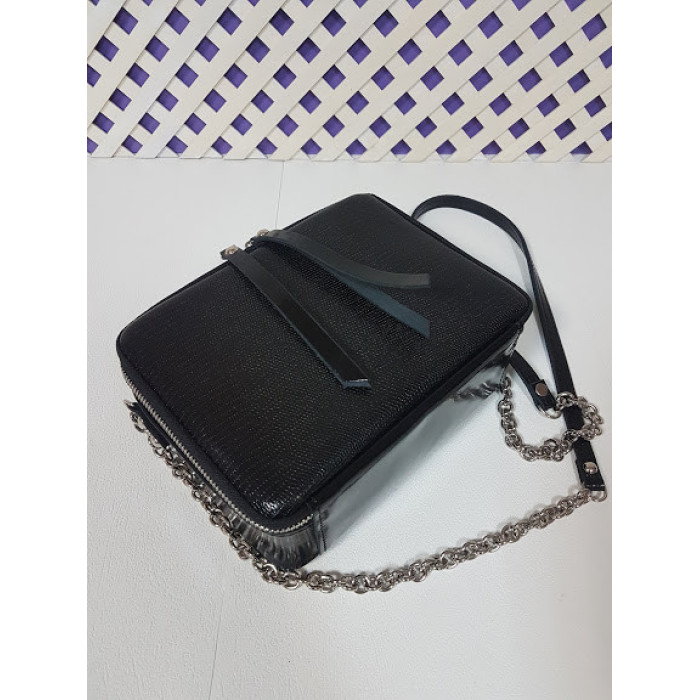 Очень оригинальная сумочка из натуральной кожи "КВАДРО".Она отлично держит форму и поместит в себя все необходимое,что надо взять с собой! Особенность этой модели в контрастной черной молнии, но, если Вы хотите, мы можем сделать ее под цвет сумки. Внутри на подкладке. Имеет небольшой внутренний кармашек. Ремешок это плотная серебряная цепь с плечевой вставкой из кожи.