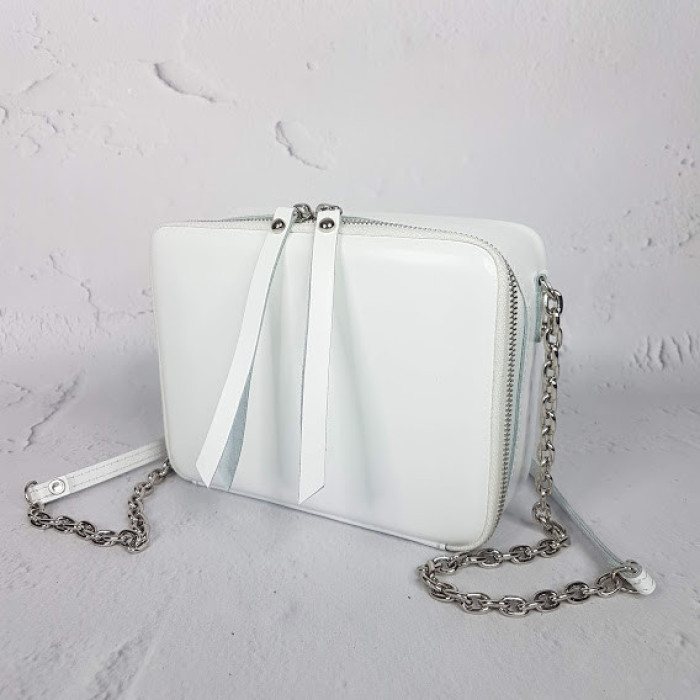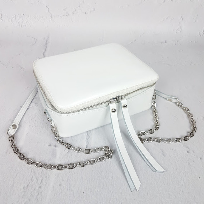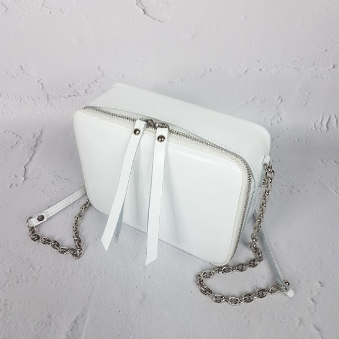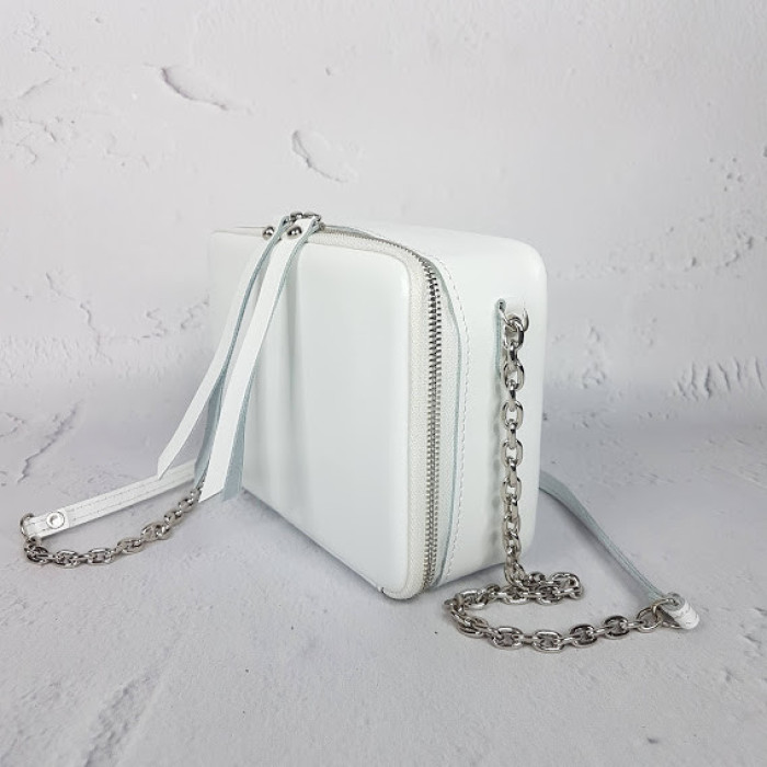 Очень оригинальная сумочка из натуральной кожи "КВАДРО". Она отлично держит форму и поместит в себя все необходимое, что надо взять с собой! Внутри на подкладке. Имеет небольшой внутренний кармашек. Ремешок это плотная серебряная цепь с плечевой вставкой из кожи.