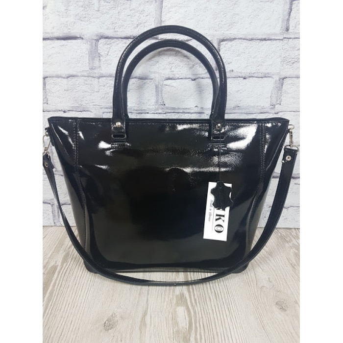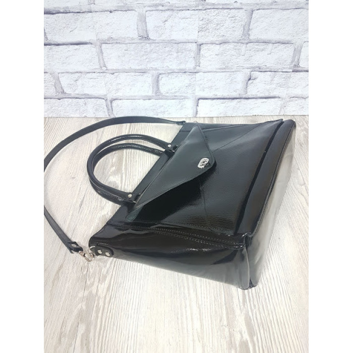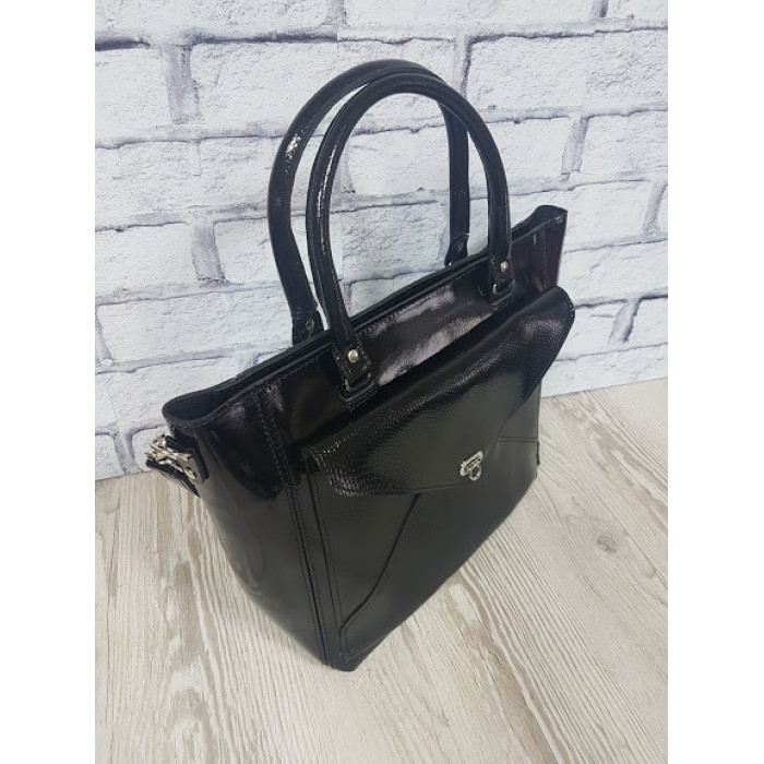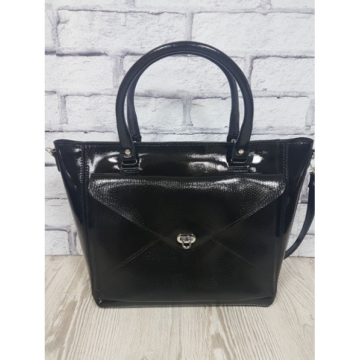 Сумка женская "Бона" натуральная кожа, черная глянцевая карман под рептилию