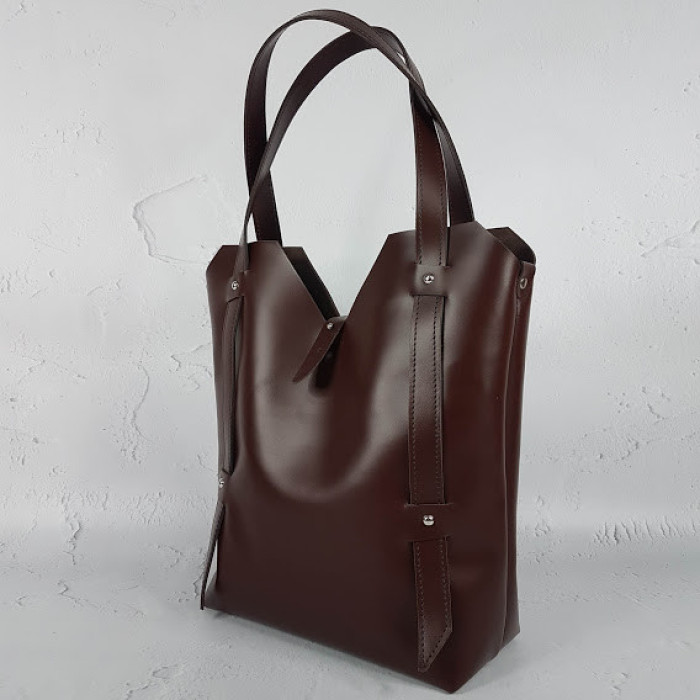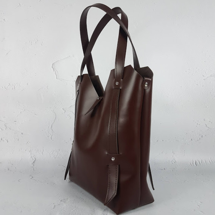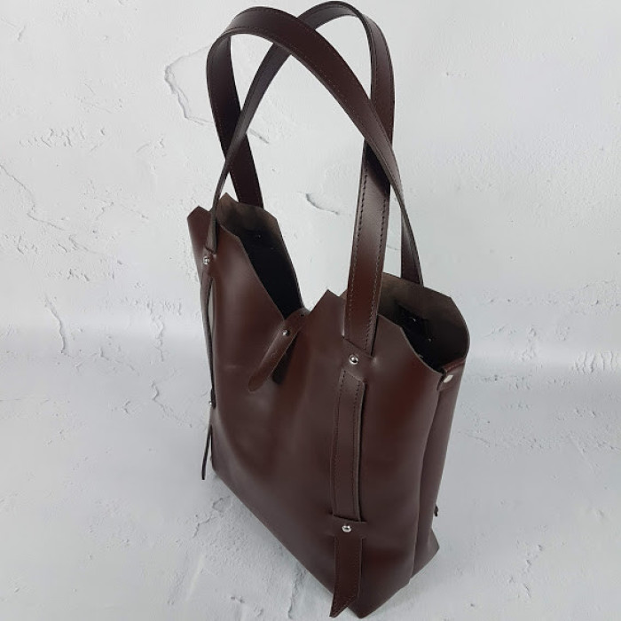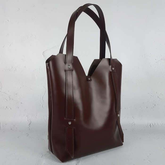 Вместительная сумка из натуральной кожи, внутри специальное отделение - футляр на молнии, которое крепится к сумке с помощью кожаного ремешка. Высота ручек 25см.
