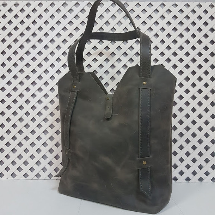 Вместительная сумка из натуральной кожи, внутри специальное отделение - футляр на молнии, которое крепится с помощью кожаного ремешка. Высота ручек 25см.