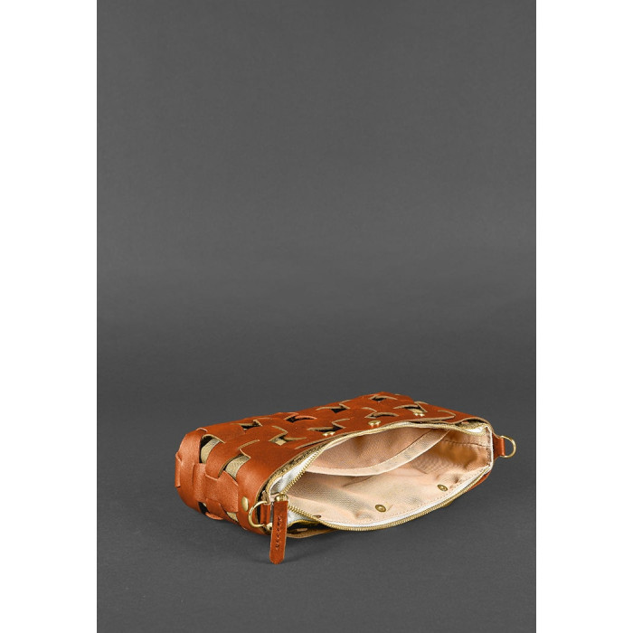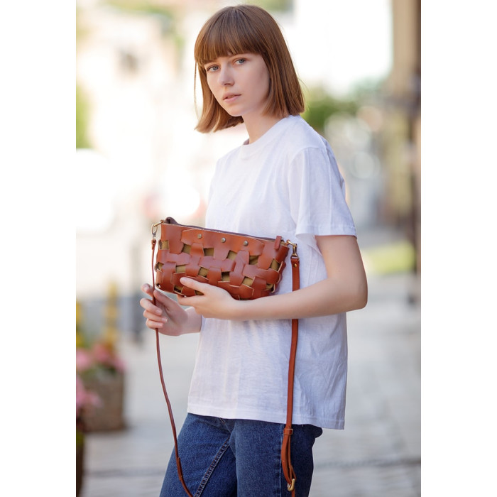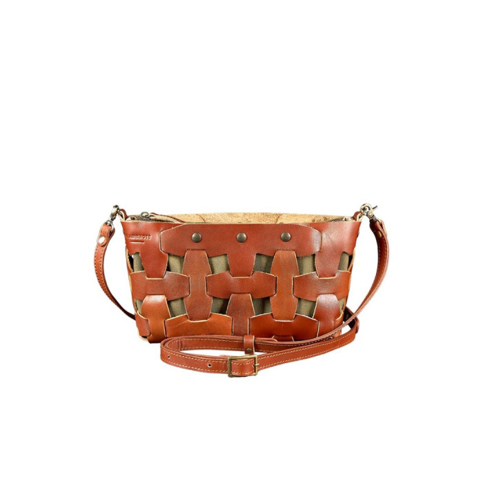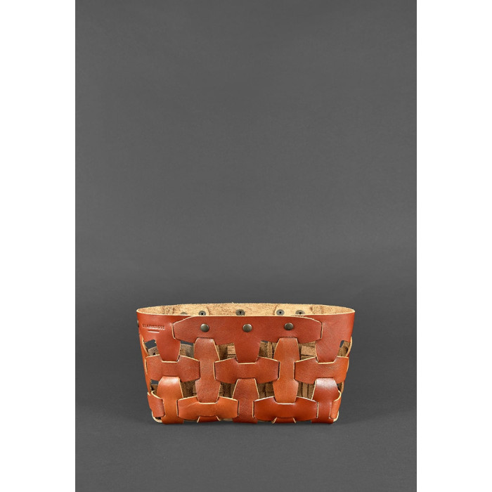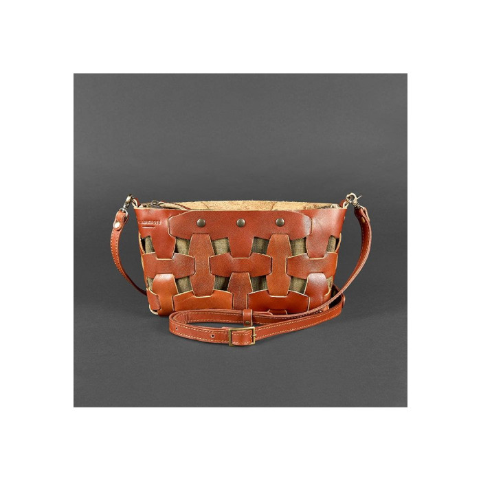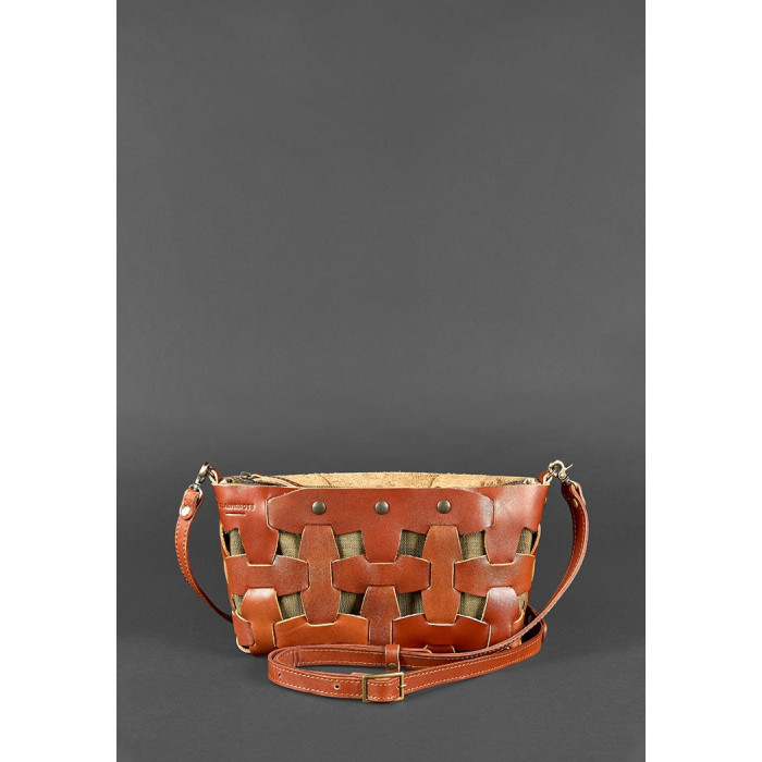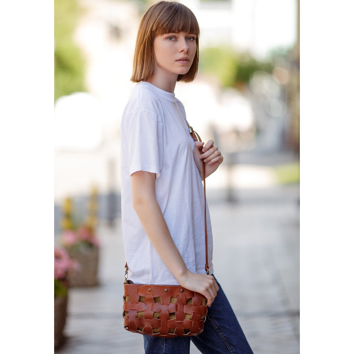 Состоит аксессуар из кожаной плетеной корзинки и внутренней текстильной сумки. Детали внешней корзинки выполнены из натуральной кожи Krast и скреплены по принципу пазлов. Для пошива внутренней сумки использовалась ткань Cordura.
