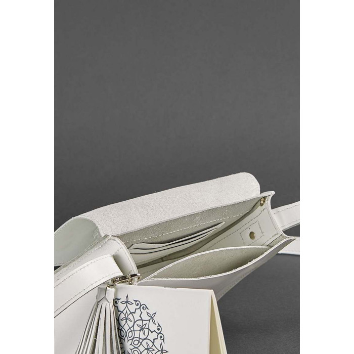 Сумка имеет два отделения и несколько маленьких кармашков для карточек и визиток. Она отлично держит форму, так как выполнена из достаточно плотной (2 мм) кожи. Носить сумку можно на плече или через плечо. Длина кожаного ремня легко регулируется. Закрывается сумка на стильный портфельный замочек, который надежно будет хранить Ваши вещи. Клапан сумки украшает орнамент, стилизованный под индийскую мандалу.