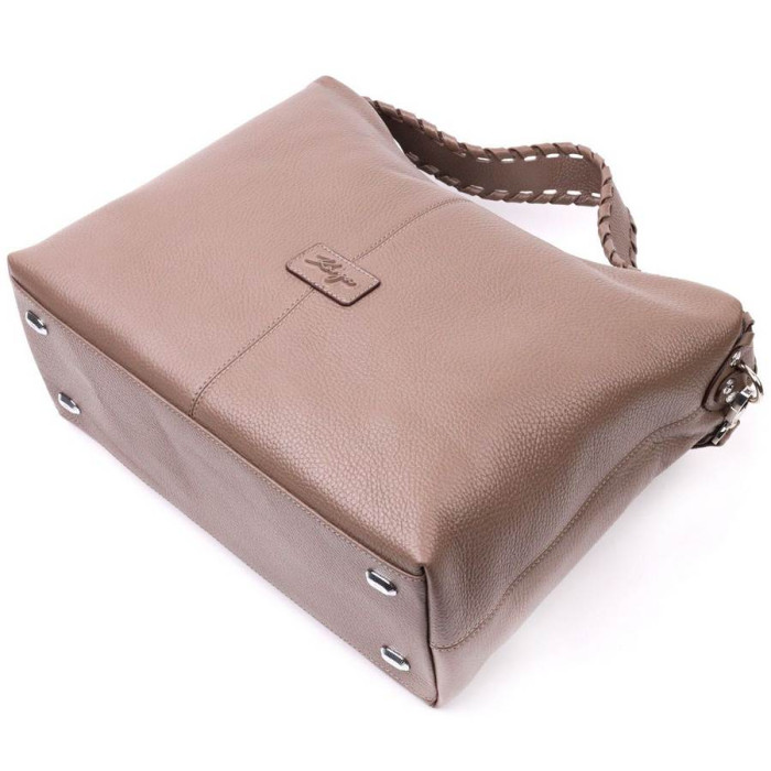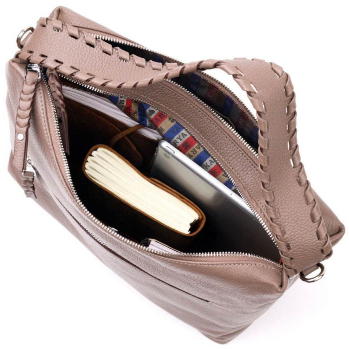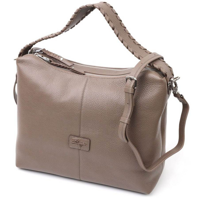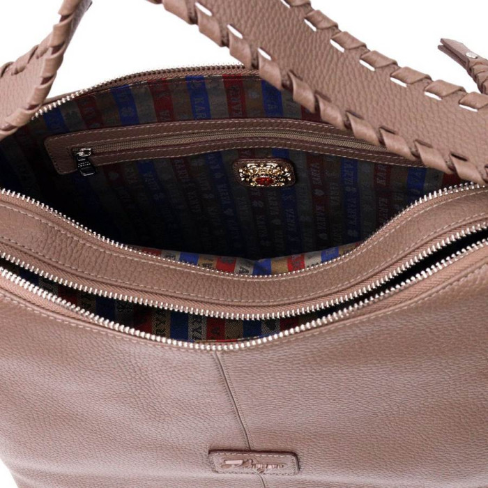 Вместительная и удобная женская сумка из натуральной зернистой кожи, красивого коричневого цвета. Сумка практичная и функциональная в эксплуатации, качественная фурнитура серебристого цвета не только дополняет стильный дизайн сумки, но и защищает изделие. Аксессуар упакован в фирменный текстильный мешок Karya. Сумка из натуральной кожи всегда будет отличным подарком любой женщине