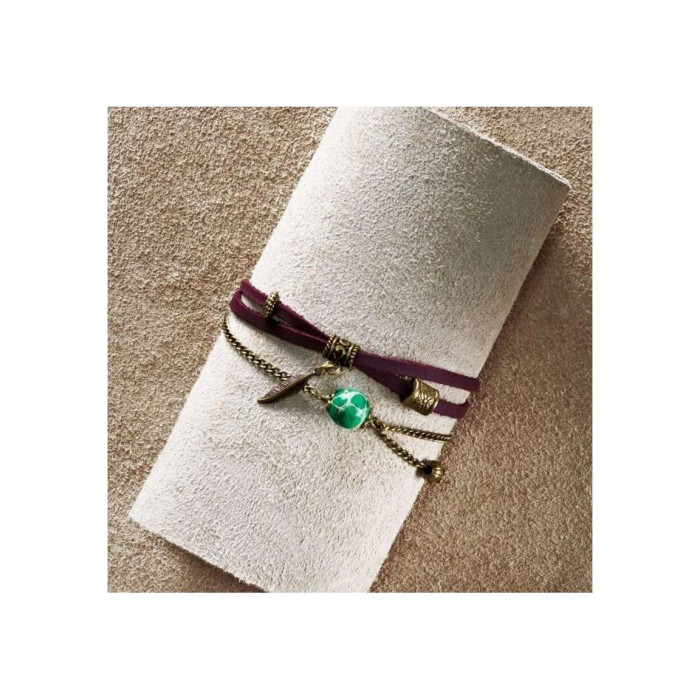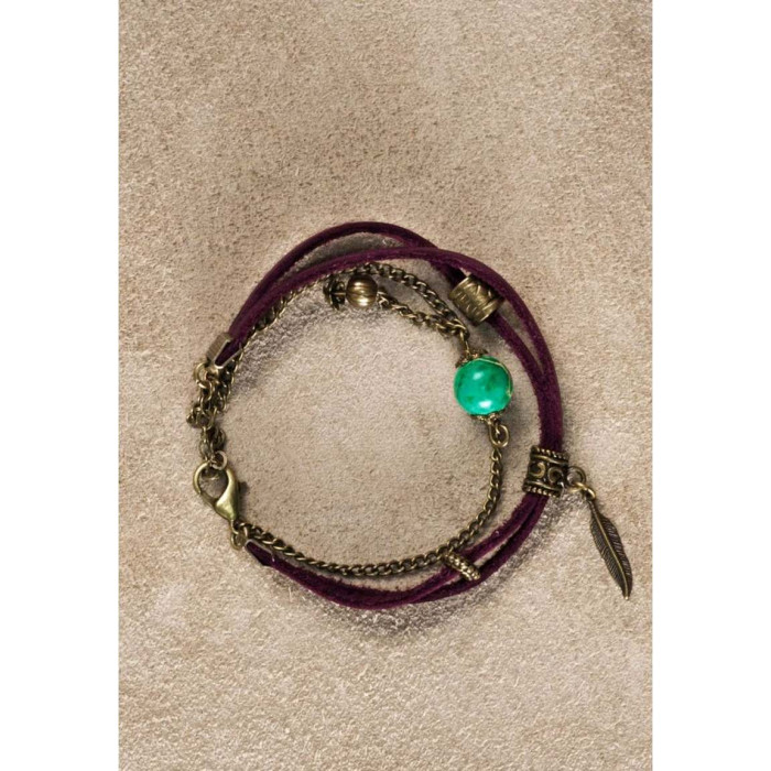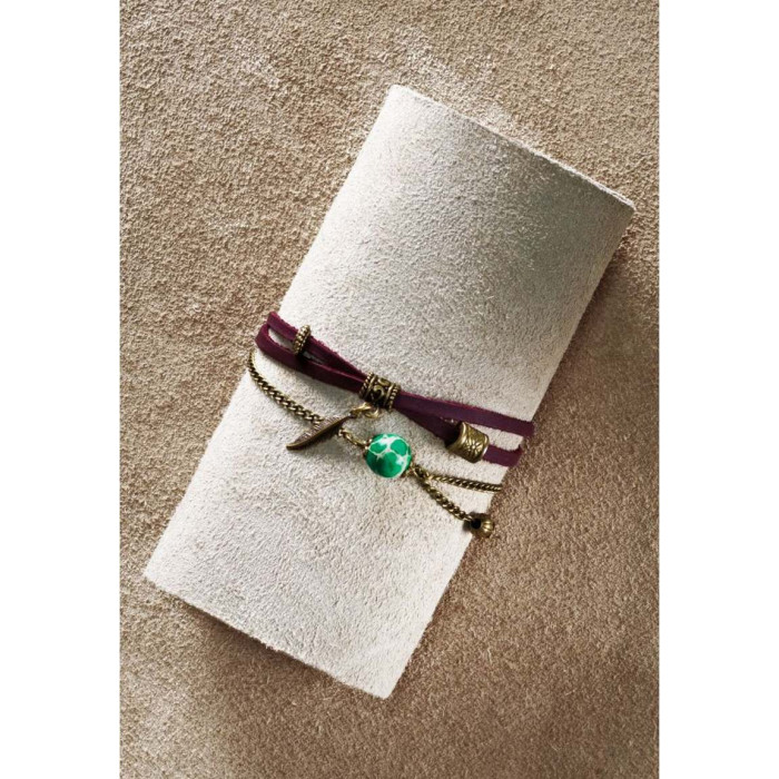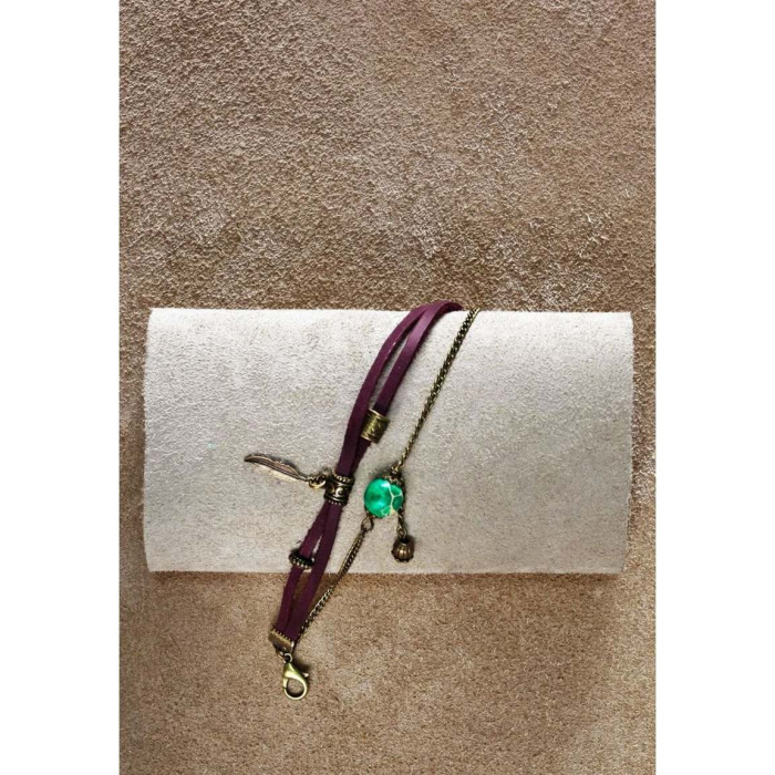 Все элементы изделия гармонично скомпонованы: кожаный шнур виноградного цвета, бронзовые крепления, голубая бусина из варисцита. Наши мастера тщательно подбирали цвета и фактуры, прежде чем вручную изготовить этот браслет. Скажем без лишней скромности: получилось отлично. В нем есть какая-то еле уловимая магия, благодаря которой его хочется носить каждый день.